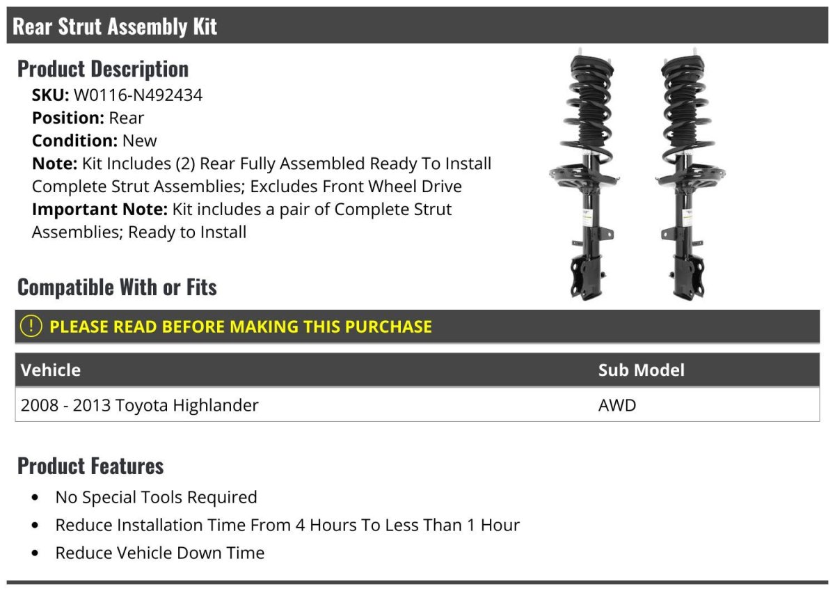 - Rear Strut And Coil Spring Assembly 2 Piece Kit For 2008-2013 Toyota Highlander Awd Excludes Front Wheel Drive