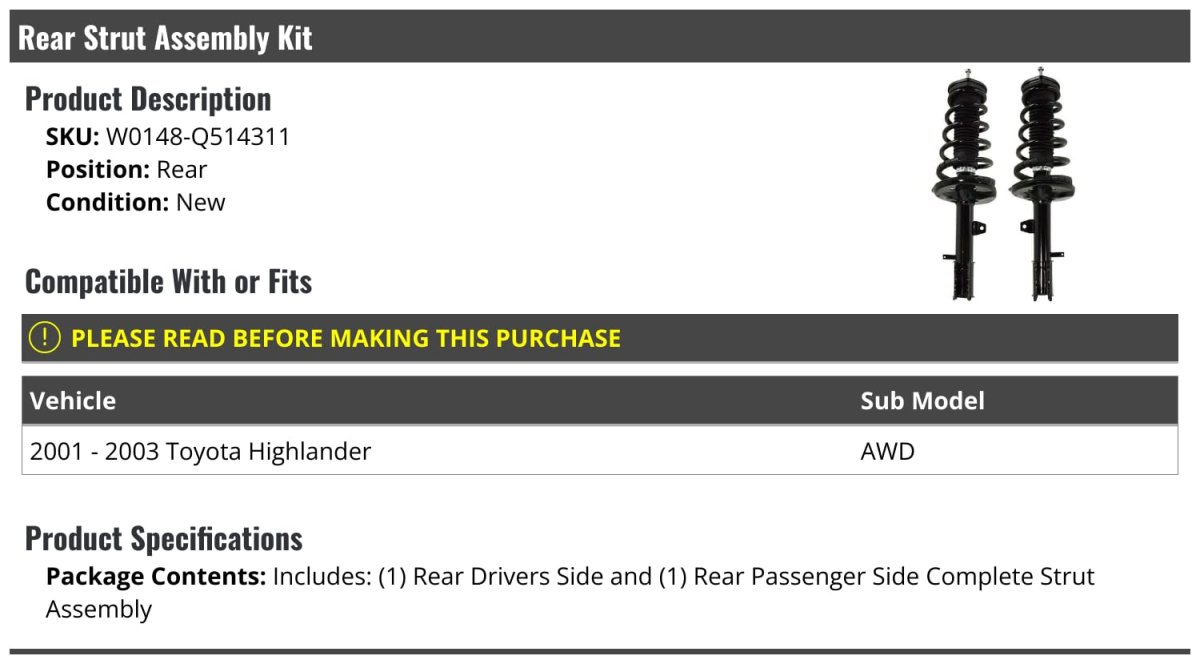 - Rear Strut And Coil Spring Assembly Kit 2- Piece For 2001-2003 Toyota Highlander Awd