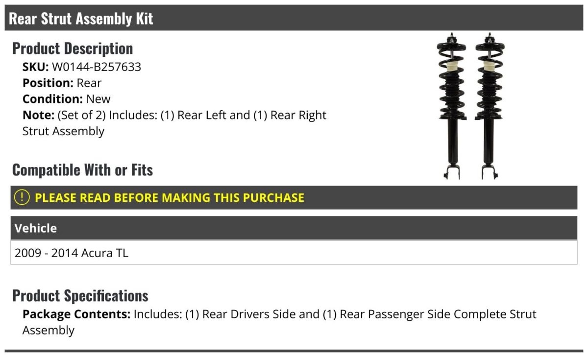 Compatible with or fits: 2009 - 2014 Acura TL. (Set of 2) Includes: (1) Rear Left Driver Side Strut and Coil Spring Assembly and (1) Rear Right Passenger Side Strut and Coil Spring Assembly. (Set of 2) Rear Strut and Coil Spring Assemblies. OE Quality. Review Description to Ensure Proper Fit.Other fine products