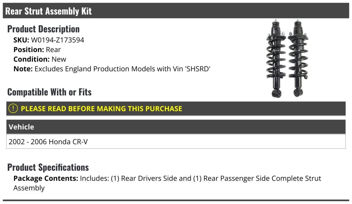 - Rear Strut And Coil Spring Assembly Set Of 2 For 2002-2006 Honda Cr-v Does Not Fit England Production Models With Vin Shsrd