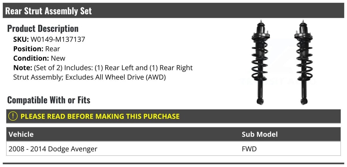 Compatible with or fits: 2008 - 2014 Dodge Avenger FWD. (Set of 2) Includes: (1) Rear Left Driver Side Strut and Coil Spring Assembly and (1) Rear Right Passenger Side Strut and Coil Spring Assembly; Excludes All Wheel Drive (AWD). Rear Strut and Coil Spring Assembly Set of 2. Review Description to Ensure Proper Fit. OE Quality.Other fine products