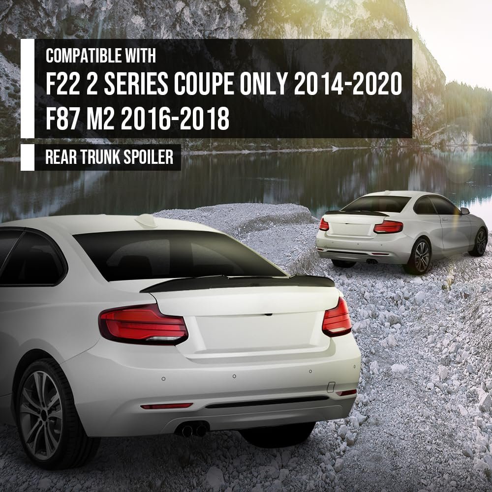 Compatibility: Compatible with BMW F22 2 Series Coupe Only 2014 2015 2016 2017 2018 2019 2020; Compatible with BMW F87 M2 2016 2017 2018. Tough quality: This rear trunk spoiler wing is made of top-grade PP material, which is not only resistant to high temperatures and corrosion, but also durable and shatterproof, ensuring that the beauty of your car is not damaged for a long time. Unique Aerodynamic Design: Not only does it enhance downforce for your vehicle, improving high-speed stability, but it also reduces fuel consumption while driving, ensuring an exceptional driving experience. Confident aesthetics: This rear trunk spoiler wing with a glossy black finish, designed to emphasize a more uniqueness, sporty and dynamic appearance, changing the overall look of your car. Easy installation and perfect fit: Our rear trunk spoiler wing is designed for simple installation and can be easily aligned with your car. Once installed, it closely conforms to the contours of the vehicle, ensuring a tight and seamless fit with the bodywork.Other fine products