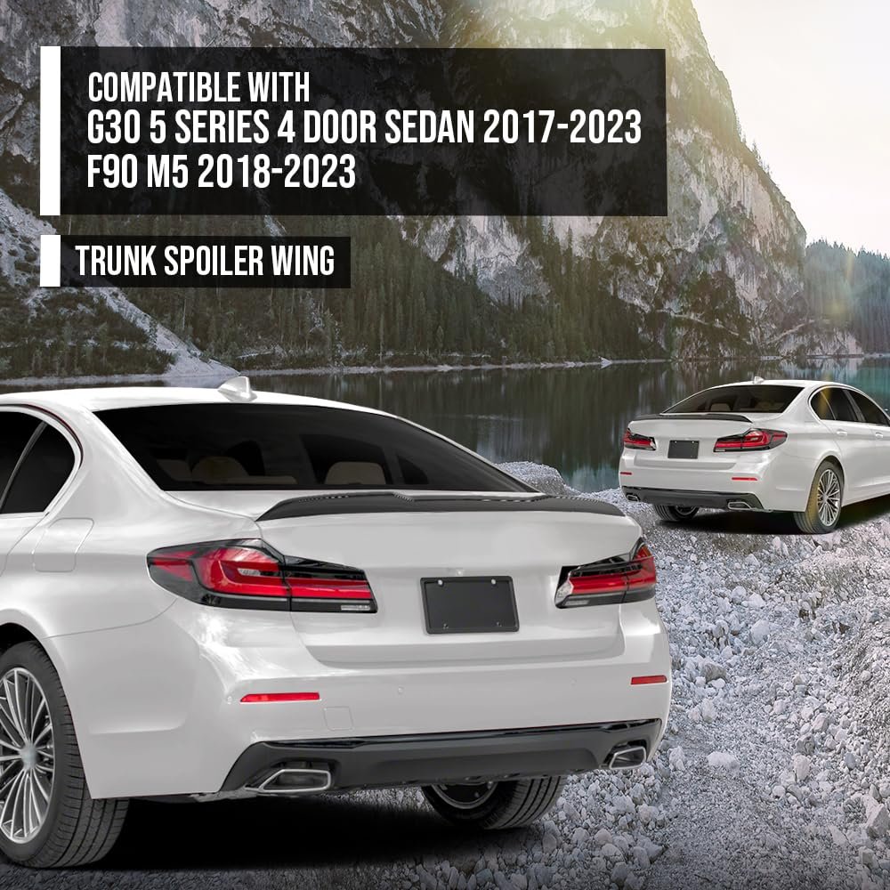 Compatibility: Compatible with BMW G30 5 Series 4 Door Sedan 2017 2018 2019 2020 2021 2022 2023; Compatible with BMW F90 M5 2018 2019 2020 2021 2022 2023. Tough quality: This rear trunk spoiler wing is made of top-grade PP material, which is not only resistant to high temperatures and corrosion, but also durable and shatterproof, ensuring that the beauty of your car is not damaged for a long time. Unique Aerodynamic Design: Not only does it enhance downforce for your vehicle, improving high-speed stability, but it also reduces fuel consumption while driving, ensuring an exceptional driving experience. Confident aesthetics: This rear trunk spoiler wing with a glossy black finish, designed to emphasize a more uniqueness, sporty and dynamic appearance, changing the overall look of your car. Easy installation and perfect fit: Our rear trunk spoiler wing is designed for simple installation and can be easily aligned with your car. Once installed, it closely conforms to the contours of the vehicle, ensuring a tight and seamless fit with the bodywork.Other fine products