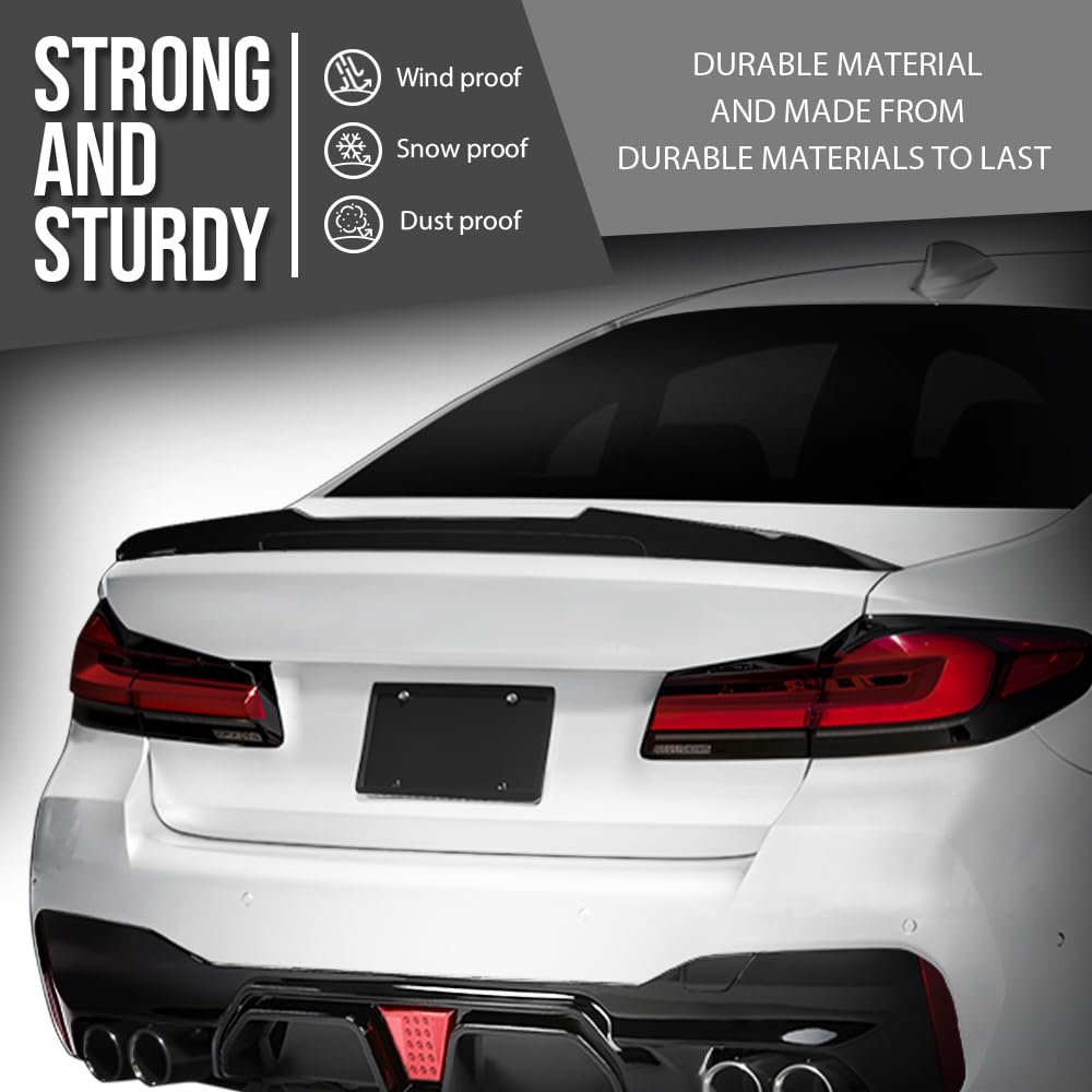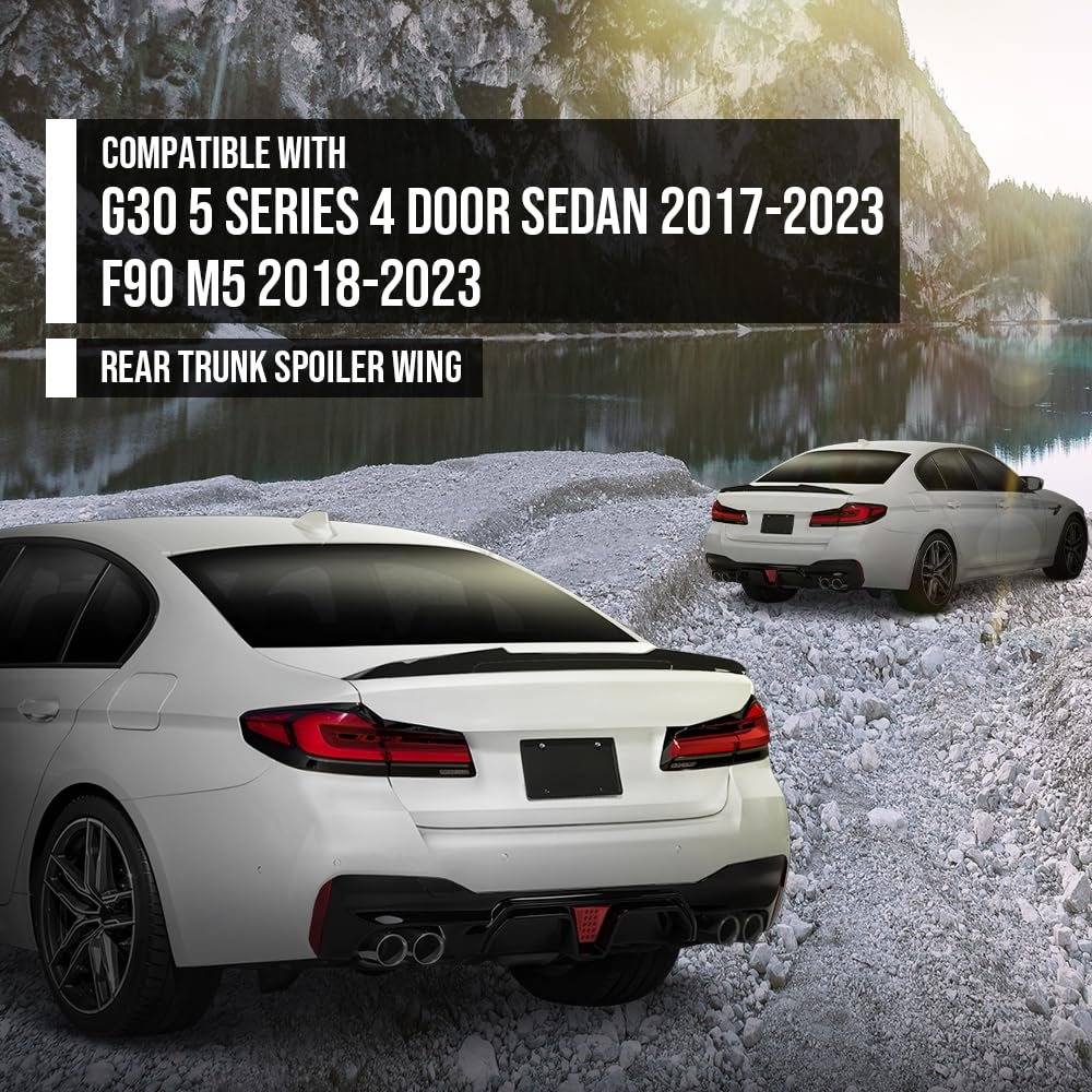 Compatibility: Compatible with BMW G30 5 Series 4 Door Sedan 2017 2018 2019 2020 2021 2022 2023; Compatible with BMW F90 M5 2018 2019 2020 2021 2022 2023. Tough quality: This rear trunk spoiler wing is made of top-grade PP material, which is not only resistant to high temperatures and corrosion, but also durable and shatterproof, ensuring that the beauty of your car is not damaged for a long time. Unique Aerodynamic Design: Not only does it enhance downforce for your vehicle, improving high-speed stability, but it also reduces fuel consumption while driving, ensuring an exceptional driving experience. Confident aesthetics: This rear trunk spoiler wing with a glossy black finish, designed to emphasize a more uniqueness, sporty and dynamic appearance, changing the overall look of your car. Easy installation and perfect fit: Our rear trunk spoiler wing is designed for simple installation and can be easily aligned with your car. Once installed, it closely conforms to the contours of the vehicle, ensuring a tight and seamless fit with the bodywork.Other fine products