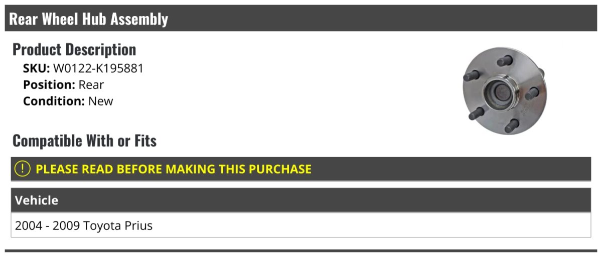 - Rear Wheel Bearing Hub Assembly For 2004-2009 Toyota Prius