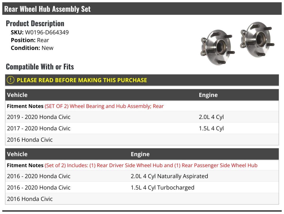 - Rear Wheel Bearing Hub Assembly Set Of 2 For 2016-2020 Honda Civic