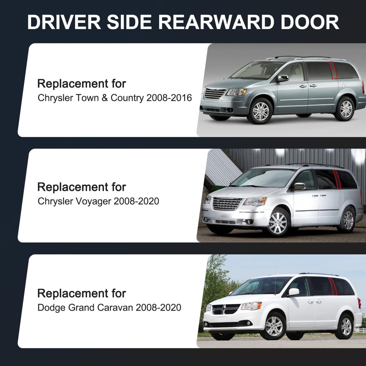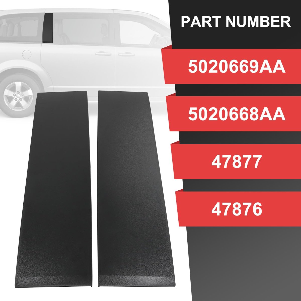 C pillar door window trim Fit for:replacement for Chrysler Town & Country 2008-2016,replacement for Chrysler Voyager 2008-2020,replacement for Dodge Grand Caravan 2008-2020.. Part number5020669AA 47877 5020668AA, 47876.Fit Position: Rear Driver & Passenger Side Rearward Door.Color:Gloss Black.. Reduce noise and prevent water leakage: Made of high grade ABS plastic and rubber,the surface is painted black,and the paint is not easy to peel off.The columnar decoration improves the windshield seal,prevents water leakage and reduces wind noise on the highway.. Fashionable design: The black C-pillar trim cover features a smooth and stylish design, with an exterior contour that matches the lines of your vehicle, effectively enhancing the overall appearance of your vehicle..Other fine products