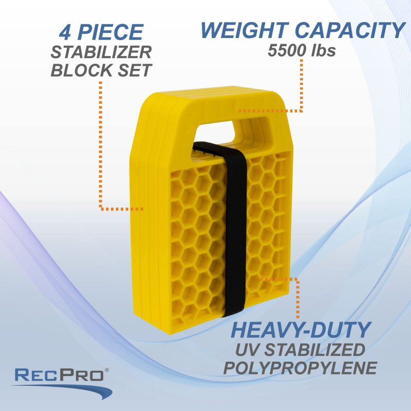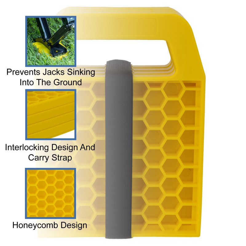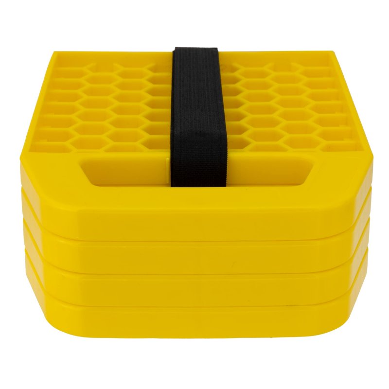 This 4-piece yellow wheel chock stabilizer set is designed to prevent your RV, camper, and trailer wheels and jacks from sinking into soft ground and loose terrains.. This unit features an interlocking design and a convenient carry strap that makes each piece easy to stack and store away.. Traditional wedge design featuring a wheel cradle cut out for added stability.. Constructed using heavy-duty UV stabilized polypropylene material with a honeycomb design for superior strength, durability, and structural integrity.. Combined load capacity of up to 2500kg, easily supporting the weight of your trailer, camper, or RV..Other fine products