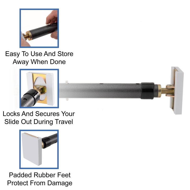 KEEP YOUR SLIDE-OUT LOCKED - During travel, use the RecPro Slide Lock to help maintain the integrity of your slide-out's external water and dust seal. The lock is made of heavy-duty steel metal with a dark gray finish and extends in length to fit most RV slide-outs.. PROTECT AGAINST WATER & DUST - The RecPro Slide Lock helps protect your RV against the elements by keeping your slide-out locked during travel. The padded rubber feet prevent scratches and scuffs on your RV's interior, while the easy-to-use design makes it simple for anyone to install.. EASY TO USE & STORE - With its adjustable length and easy-to-use design, the RecPro Slide Lock is ideal for any RV owner. The lock can be installed in minutes and quickly folds up for easy storage when not in use.. MULTIPLE APPLICATIONS - The RecPro slide lock isn't just for RVs! Use it on sheds, trailers, boats, or any other item that needs a little extra security. Durable enough for everyday use but compact and easy to store when not in use..Other fine products
