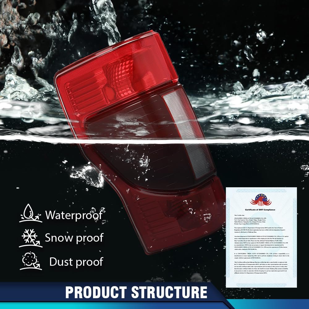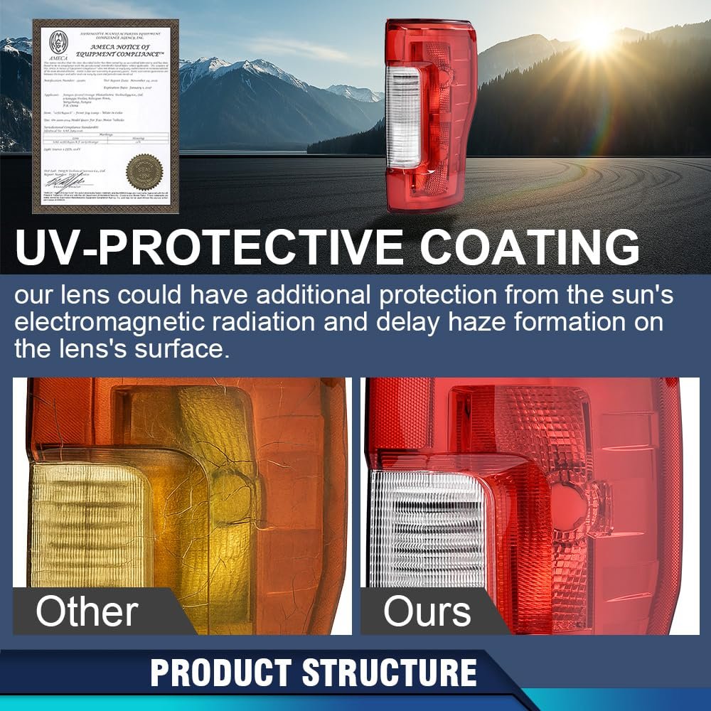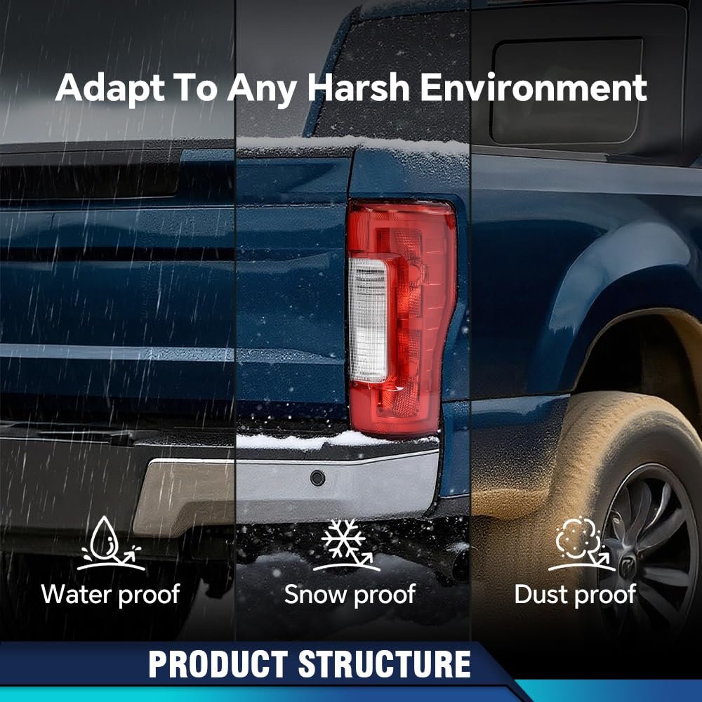 Fitment:Compatible with Ford F250 F350 Super Duty 2017-2019. Compatible with Factory Incandescent Tail Light w/o Blind Spot Monitor Model.. OE Standard:FO2800256, HC3Z13405D, HC3Z13405F, FO2801256, HC3Z13404D, HC3Z13404F.. DOT/SAE certification:Severe bumpy driving will not hinder the normal illumination of the tail lights. Adopting a fully sealed design and equipped with one-way ventilation openings to prevent moisture from being trapped inside.. Fully sealed design:Adopting a fully sealed design and equipped with one-way ventilation openings to prevent moisture from being trapped inside.Enhance rear visibility and appearance, making your vehicle more easily visible to other drivers and passengers to ensure driving safety..Other fine products