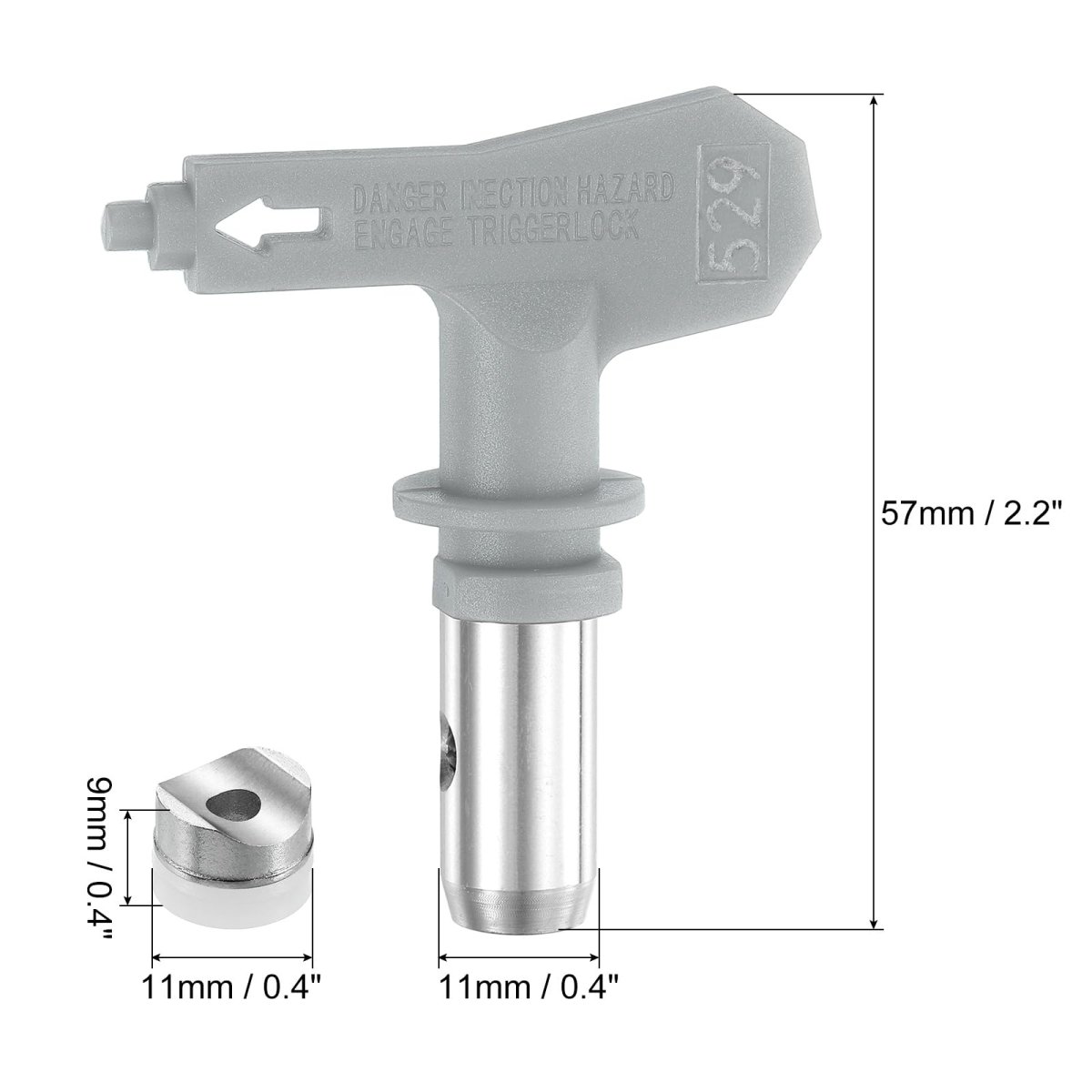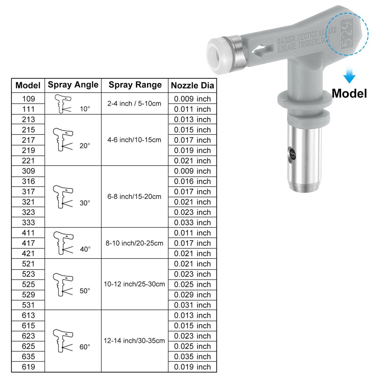 Model: 529 Airless sprayer tip, nozzle diameter: 0.009 inch, spray angle: 30.. Quality Materials: Airless spray tip nozzles are made of quality 304 stainless steel handle and tungsten carbide nozzle, which is a durable and wear-resistant material that can withstand the high pressures and abrasive nature of the materials being sprayed.. Wide Application: It can handle various coatings (latex paint, oil-based paint, varnishes, etc), and suitable for different types of airless sprayers, meeting your various needs such as homes, buildings, garden fences, and furniture.. Easy to Install: Align the threads of the new spray tip with the nozzle opening on the sprayer. Gently screw it in clockwise until it is firmly secured.. Cleaning and Maintenance: Properly clean and maintain your spray tip after each use to prevent clogs and ensure longevity. Use appropriate cleaning solutions and tools, such as tip cleaners or brushes, to remove any dried material..Other fine products