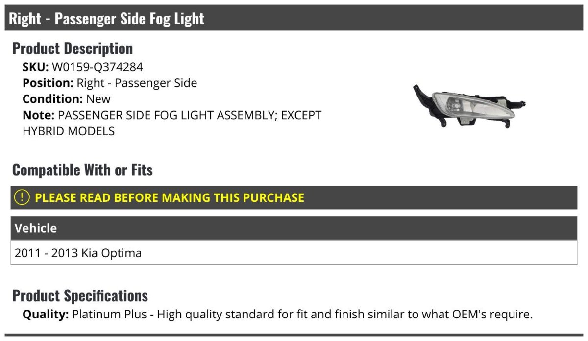 - Right Passenger Side Fog Light Assembly For 2011-2013 Kia Optima Except Hybrid Models