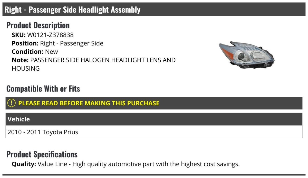- Right Passenger Side Halogen Headlight Assembly For 2010-2011 Toyota Prius