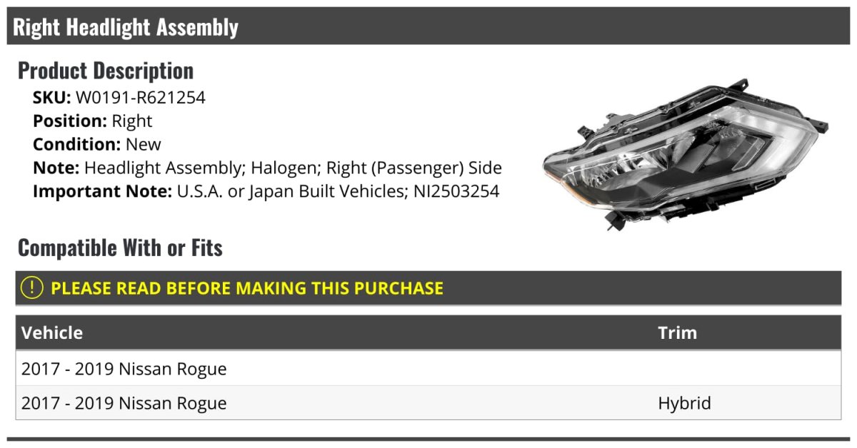 - Right Passenger Side Halogen Headlight Assembly For 2017-2019 Nissan Rogue