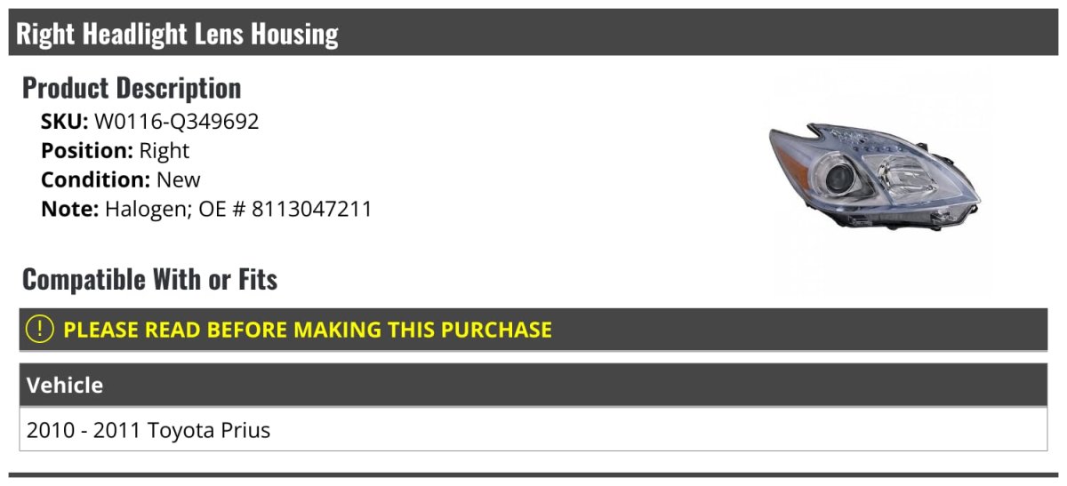 - Right Passenger Side Halogen Headlight Lens Housing For 2010-2011 Toyota Prius