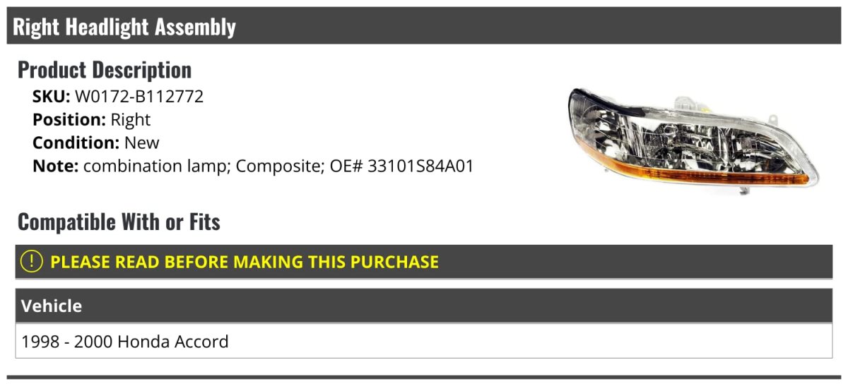Combination lamp; Composite; OE# 33101S84A01. Compatible with or fits: 1998 - 2000 Honda Accord. Right Headlight Assembly. Review Description to Ensure Proper Fit.