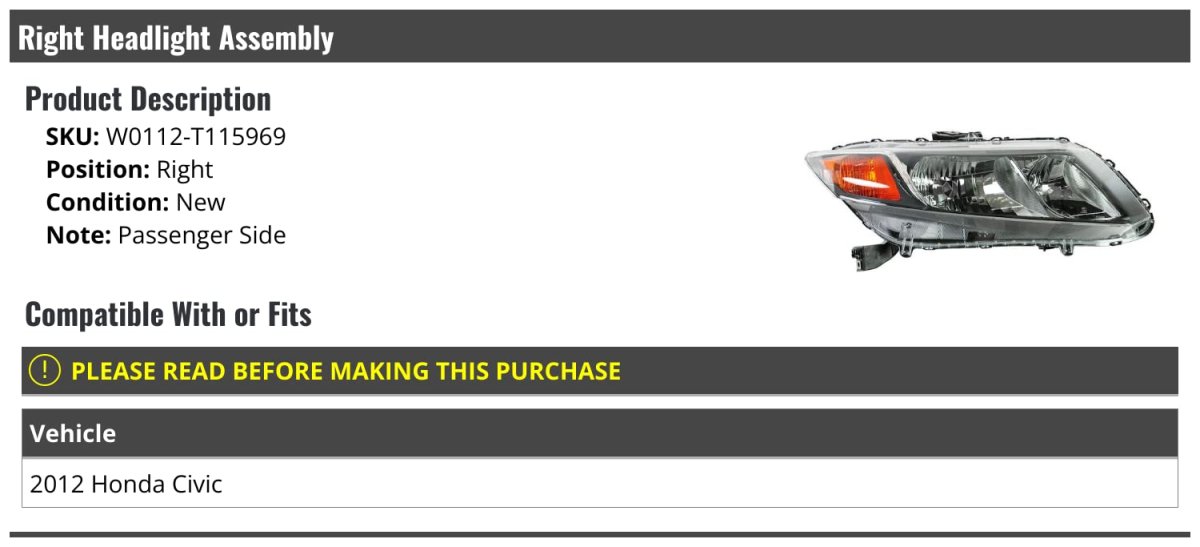 Passenger Side. Compatible with or fits: 2012 Honda Civic. Right Headlight Assembly. Review Description to Ensure Proper Fit.