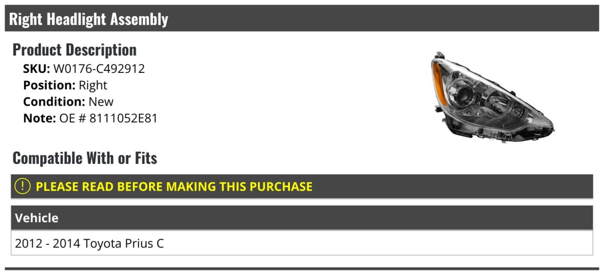 - Right Passenger Side Headlight Assembly For 2012-2014 Toyota Prius C
