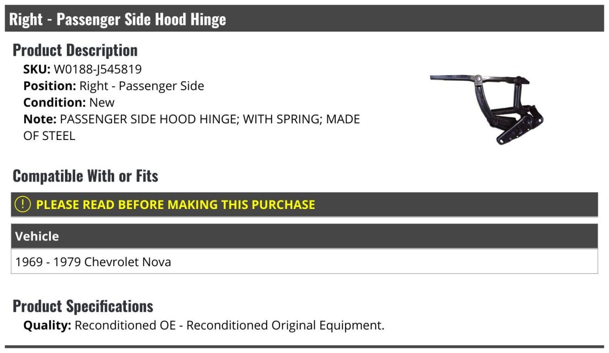 - Right Passenger Side Hood Hinge With Spring For 1969-1979 Chevy Nova