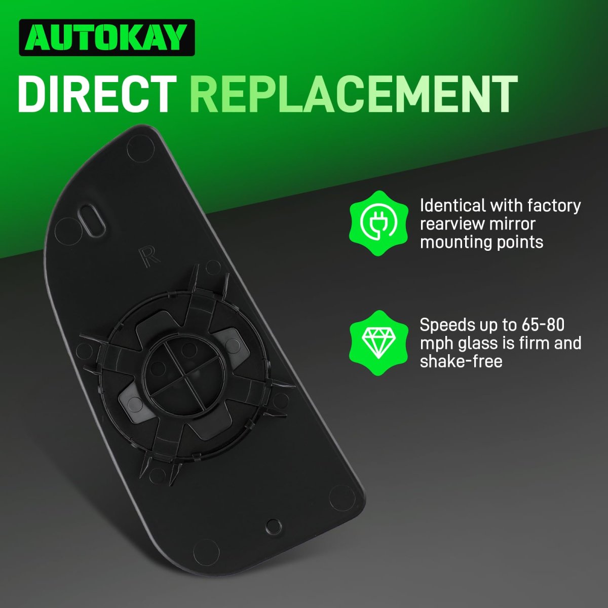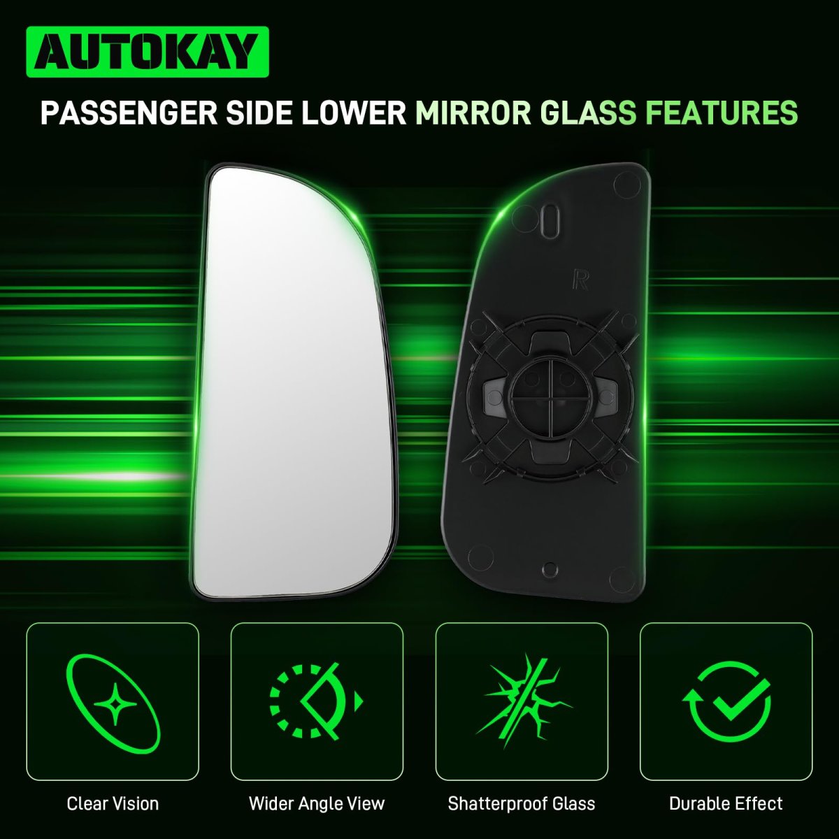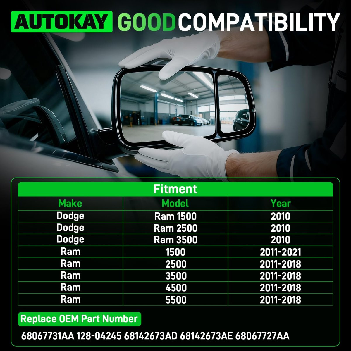 Perfect FitmentThe right passenger side lower towing mirror glass fits for Dodge Ram 1500 2500 3500 4500 5500 2010 2011 2012 2013 2014 2015 2016 2017 2018 2019 2020. Replace Part NumberThe right passenger side lower mirror glass replaces 68067730AA, CH1325125. DurableThe passenger side lower mirror glass replacement is made of high-quality glass and heavy-duty ABS materials, firm and not deformed, durable and has a long-lasting performance. Enhanced VisibilityConvex glass designed to maximize rearward vision, reducing blind spot for improved driving confidence, chrom plated glass with anti-glare function for clear rear views. Easy InstallationThe towing mirror glass is identical to the original factory style, perfectly fit with the existing electrical wiring. It is a direct replacement and easy to install, no professional tools required.