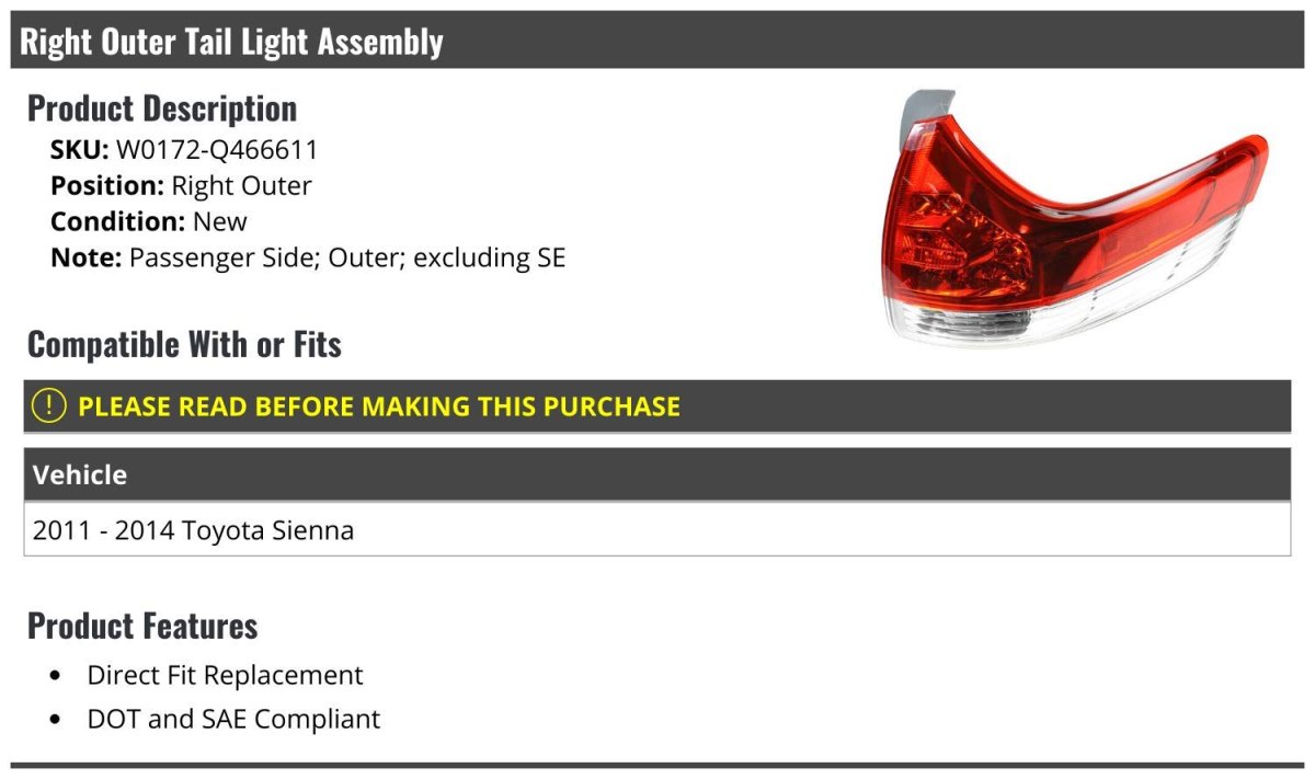 - Right Passenger Side Outer Tail Light Assembly For 2011-2014 Toyota Sienna Excluding Se