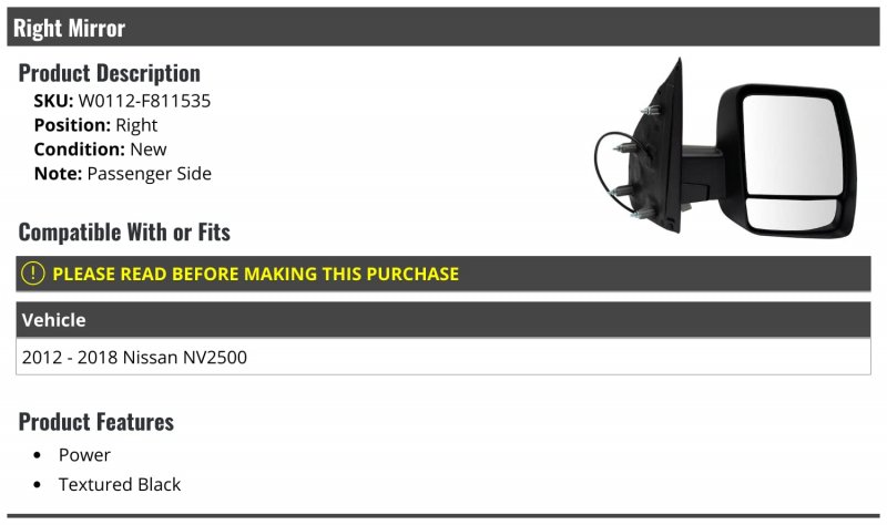 - Right Passenger Side Power Mirror Textured Black Compatible With 2012 2018 Nissan Nv2500