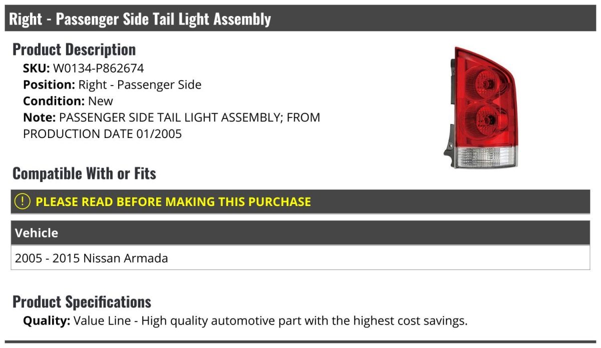 PASSENGER SIDE TAIL LIGHT ASSEMBLY; FROM PRODUCTION DATE 01/2005. Compatible with or fits: 2005 - 2015 Nissan Armada. Quality: Value Line - automotive part with the highest cost savings.. Right - Passenger Side Tail Light Assembly. Review Description to Ensure Proper Fit.Other fine products