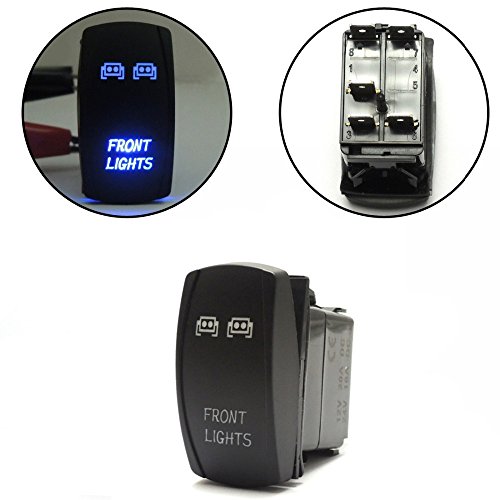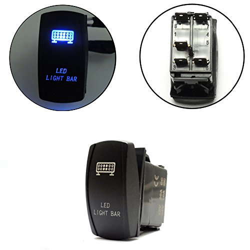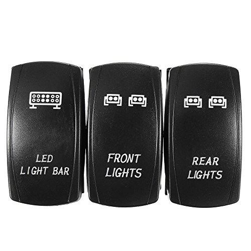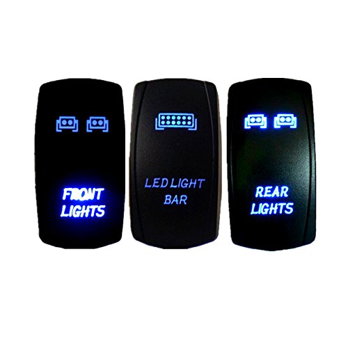 SurfSize:50mm*26mm Thickness: 43mm Standard size mounting hole 1. 41" (36mm) x. 86" (22mm). Input: 20 A 12 V FITMENT: For UTV POLARIS RZR 4 XP 900 1000 Ranger, Boats, Cars, Trucks, Machines, Tractors, Heavy Equipment, Feature: LASER ETCHED WITH TWO L. E. D. LIGHTS Single Pole Single Throw ON-OFF Switch Black hard surfrocker Upper light is ON when the switch is pressed UP Lower LED is independent and can be wired to separate light circuit. Both LEDs have separate grounds. No rear barriers between terminals. Lower light Waterproof rating of IP66. and long service life. Easy to install. Package Includes: 3 x Blue Rocker Switch Model # kg-3t01 Features: Package Include: Front Light Switch + Rear Light Switch + LED Light Bar Switch Standard size mounting hole 1. 41" (36mm) x. 86" (22mm). FITMENT: For UTV POLARIS RZR 4 XP 900 1000 Ranger, Boats, Cars, Trucks, Machines, Tractors, Heavy Equipment, SurfSize:50mm*26mm, Thickness: 43mm Upper light is ON when the switch is pressed UP Item Dimensions: 1. 97" L x 1. 02" W x 1. 77" H.Other fine products
