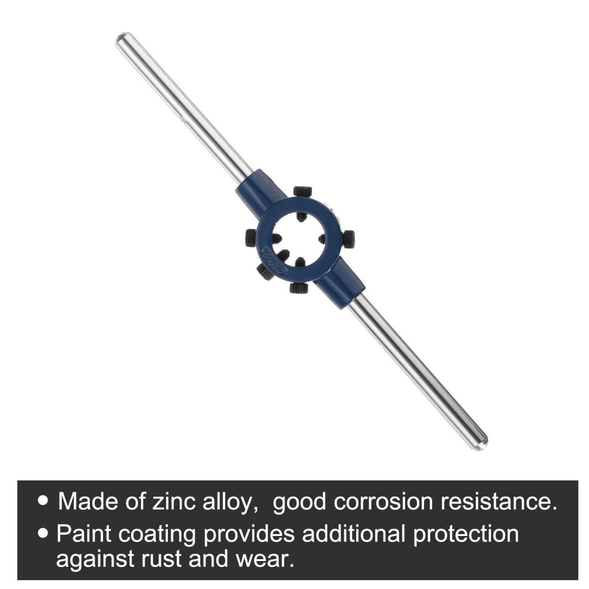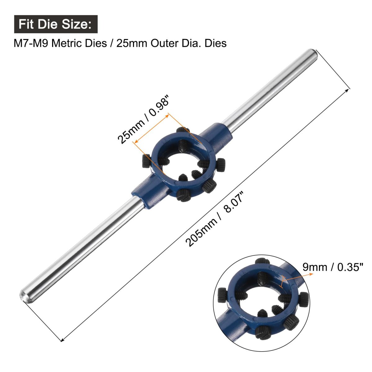 Round Die Stock Handle Wrench: Fit Die Size: M7-M9 Metric Dies / 25mm Outer Dia. Dies; Total Size: 205mm x 11mm / 8.07" x 0.43" (L*T). Die holder is made of zinc alloy, which has good corrosion resistance, a beautiful shape, and is relatively light and portable. The paint coating on the surface provides additional protection against rust and wear, to extend the service life of adjustable wrenches.. Sturdy Wrench: Round die stock handle is designed with 5 adjustable screws to fix the die, die frame can firmly fix the round die and is easy to operate. The frame helps to keep the cutting tool aligned. It can ensure that the thread spacing is even and cut to the required specifications.. Widely Used: Die handle wrench (when used with round dies) can be used on mild steel, aluminum, plastics, and most metals, helping to process, repair, correct, clean external threads, or simply remove bolts and threaded rods. Suitable for house renovation, DIY home improvement projects, construction, auto repair, factories, etc.. Easy to use: The positioning slot of the mould (not included) should be aligned with the tightening screw of the wrench, and the screw should be inserted into the mould slot and tightened. Before you start tapping, apply cutting oil or lubricant to the workpiece and die to get smoother, cleaner threads.. Tips: Every 1/41/2 turn needs to be reversed to facilitate the discharge of chips from the chip removal hole. Apply even and consistent pressure when turning the handle. Tighten the mould base's adjustable screws firmly around the mould to ensure a secure grip..Other fine products