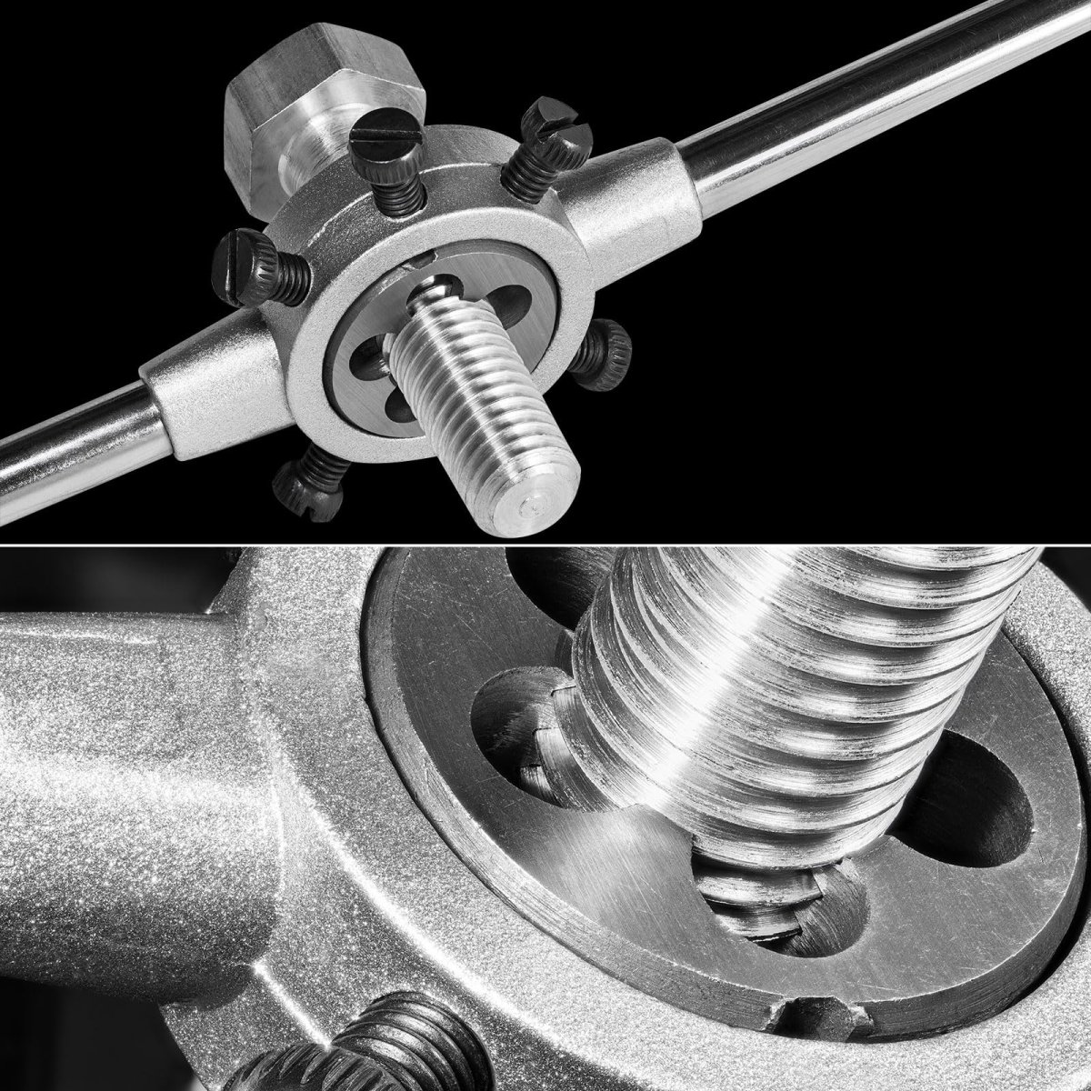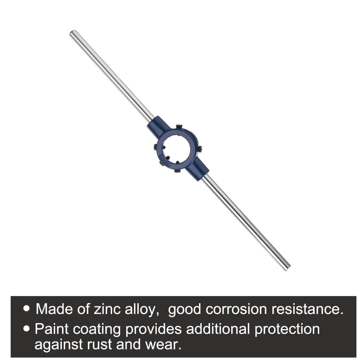 Round Die Stock Handle Wrench: Fit Die Size: M22-M24 Metric Dies / 55mm Outer Dia. Dies; Total Size: 495mm x 25mm / 19.49" x 0.98" (L*T). Die holder is made of zinc alloy, which has good corrosion resistance, a beautiful shape, and is relatively light and portable. The paint coating on the surface provides additional protection against rust and wear, to extend the service life of adjustable wrenches.. Sturdy Wrench: Round die stock handle is designed with 5 adjustable screws to fix the die, die frame can firmly fix the round die and is easy to operate. The frame helps to keep the cutting tool aligned. It can ensure that the thread spacing is even and cut to the required specifications.. Widely Used: Die handle wrench (when used with round dies) can be used on mild steel, aluminum, plastics, and most metals, helping to process, repair, correct, clean external threads, or simply remove bolts and threaded rods. Suitable for house renovation, DIY home improvement projects, construction, auto repair, factories, etc.. Easy to use: The positioning slot of the mould (not included) should be aligned with the tightening screw of the wrench, and the screw should be inserted into the mould slot and tightened. Before you start tapping, apply cutting oil or lubricant to the workpiece and die to get smoother, cleaner threads.. Tips: Every 1/41/2 turn needs to be reversed to facilitate the discharge of chips from the chip removal hole. Apply even and consistent pressure when turning the handle. Tighten the mould base's adjustable screws firmly around the mould to ensure a secure grip..Other fine products