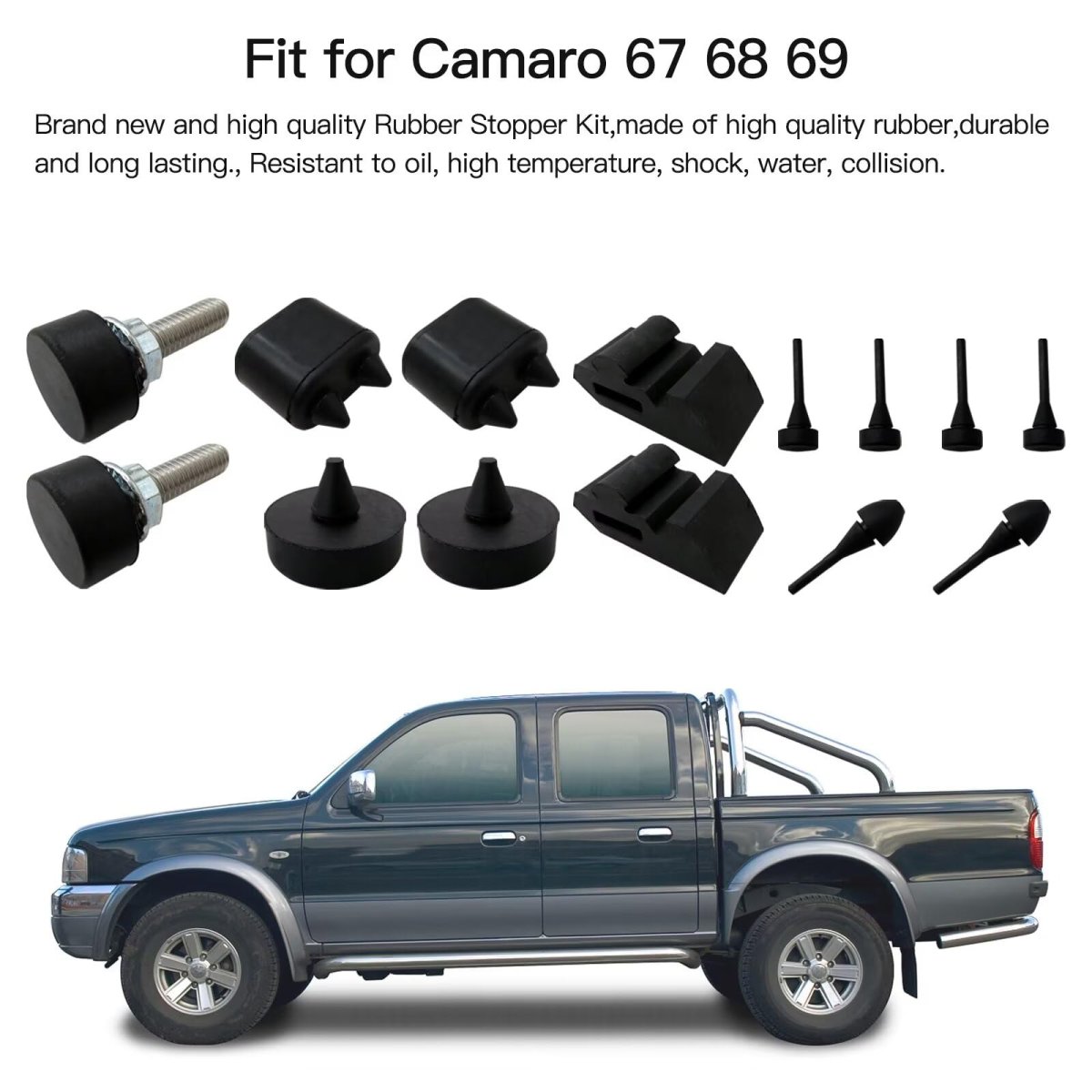> > Rubber Stopper Kit for the car and a Hood Adjuster Kit for the radiator support. > > Fitment:for Chevrolet Camaro both coupe 1967 1968 1969;for Chevrolet Camaro convertible 1967 1968 1969. > > The hood adjuster bumper stopper kit is easy and convenient to install, without any complicated procedures. A good and perfect replacement for the old or shabby rubber bumper stopper. > > The rubber hood bumper stopper helps improve braking efficiency in an efficient and excellent way. The rubber hood bumper stopper meets or exceeds the standard specifications and strictly follows the factory quality control. > > Package Include:1 SET Hood Adjusters Rubber Stopper Kit.