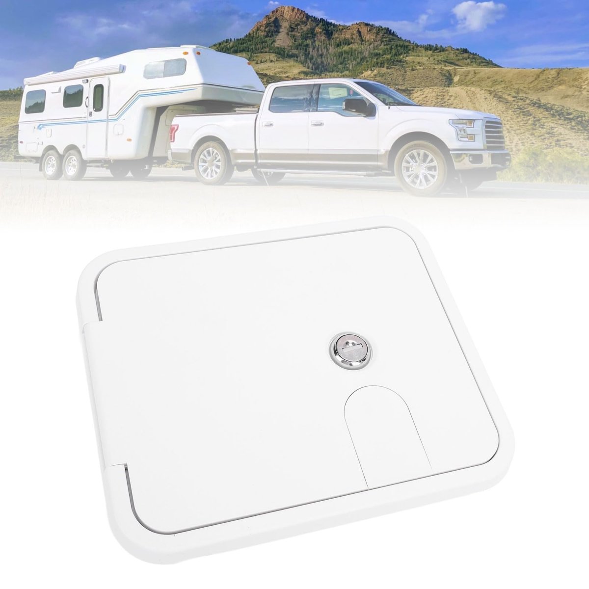 Sturdy Material: The power cord hatch is made with engineering grade ABS material, erosion, anti aging, and not easily yellowing even under long term sunlight exposure.. Stainless Steel Lock: Featuring 145 x 116mm flush mount design, this trailer electric power cable hatch comes with stainless steel safety lock and screws, ensuring rusting proof usage.. Secure Access: This RV power cord access door includes 2 keys and a slide window for door closure while connected, providing secure access to your power cord.. Easy Installation: Designed to replace old and damaged power cord hatches, this cable hatch allows for convenient 180 degree opening and closing for maintenance, filling, charging, and more applications.. Versatile Application: Suitable for RVs, trailers, yachts, and more, this power cord access door provides a convenient and secure solution for accessing and managing power cords on your vehicle..Other fine products