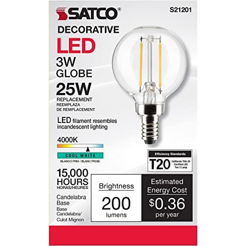 Traditional Meets Contemporary: Satco's S21201 3-watt LED lamp has a vintage style with modern energy saving LED technology, delivering over 15,000 hours of cool white light. Control the Look of Your Space: Elegantly illuminate any room in the house with this dimmable, clear bulb. Saves Money, Lasts Longer: With 90 CRI and 200 Lumens, this bulb provides vivid color, and has a 15000 hour rating- keeping your home bright and energy friendly. Specs: Candelabra Base G16.5 Lamp Shape MOL: 3.11 inches, MOD: 1.97 inches 120 Volts.Other fine products