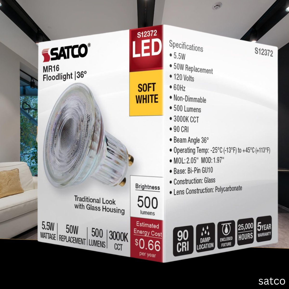 - Satco Led Mr16 Floodlight 5 5w 50w Equivalent 3000k Soft White 90 Cri 36a Beam Gu10 Twist-lock Base 120v Dimmable Clear Finish