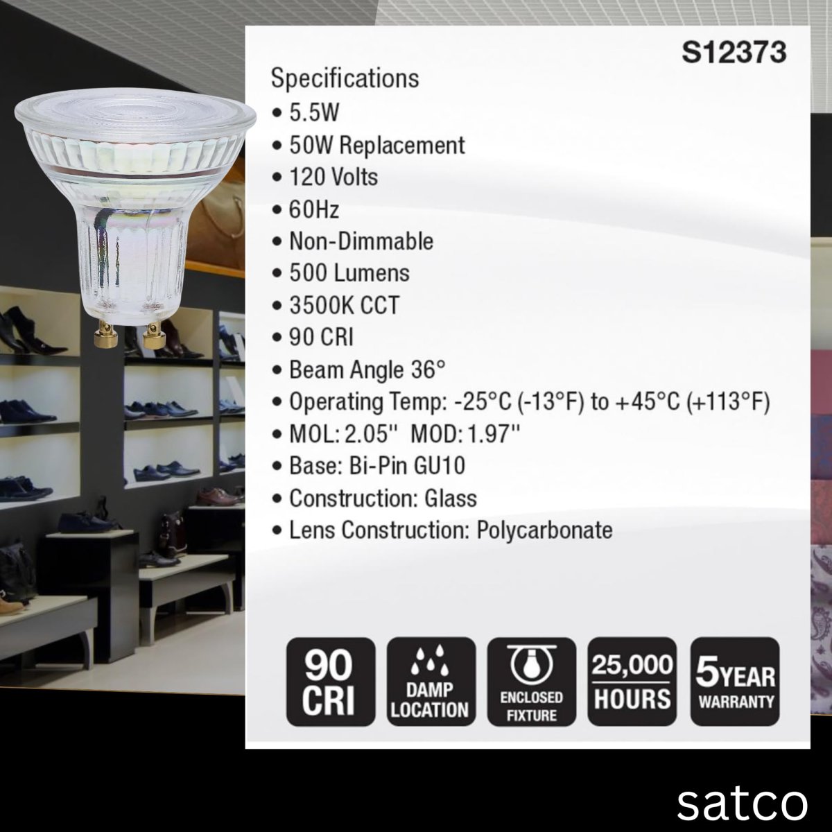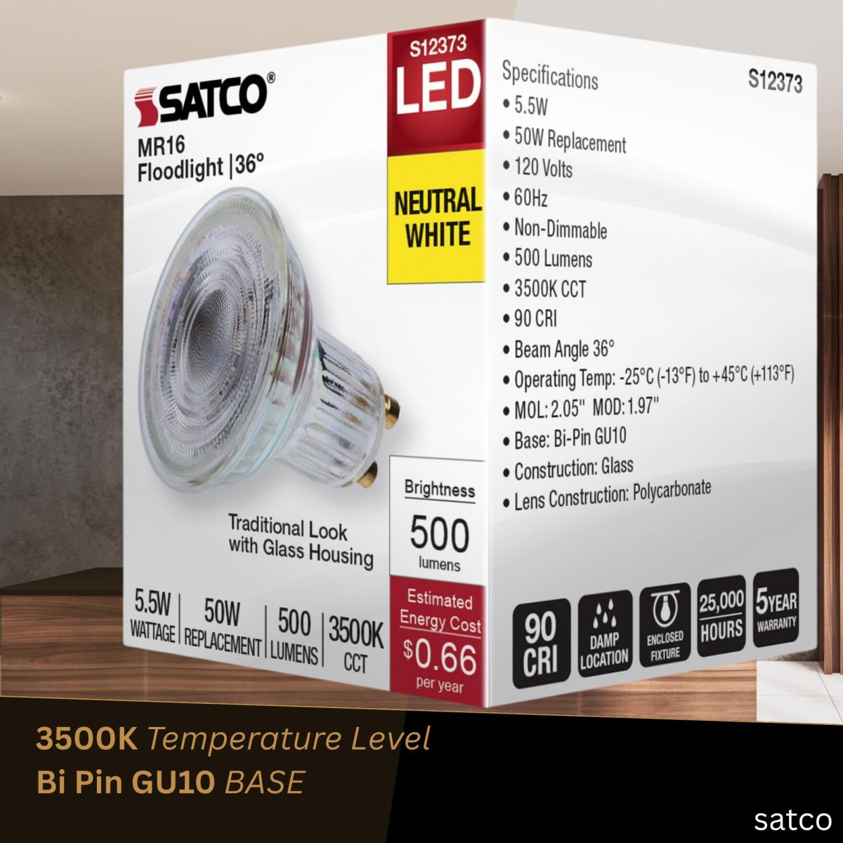 - Satco Led Mr16 Floodlight 5 5w 50w Equivalent 3500k Neutral White 90 Cri 36a Beam Gu10 Twist-lock Base 120v Dimmable Clear