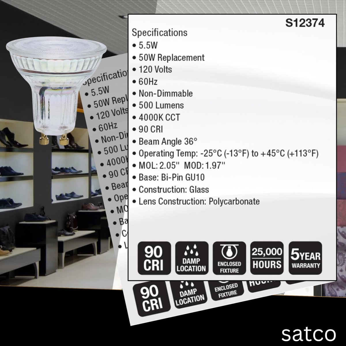 4000K Cool White Light: Delivers crisp, neutral brightness ideal for task lighting, kitchens, retail spaces, and offices.. 5.5W LED Replaces 50W Halogen: Provides full 500-lumen output while cutting energy consumption by over 85%.. 36 Flood Beam Angle: Ensures broad, even light distribution for highlighting work surfaces or display areas.. GU10 Twist-Lock Base for 120V: Securely fits standard directional fixtures for quick, tool-free installation.. 90+ CRI for High Color Accuracy: Enhances visual clarity and detail in both residential dcor and commercial merchandising..