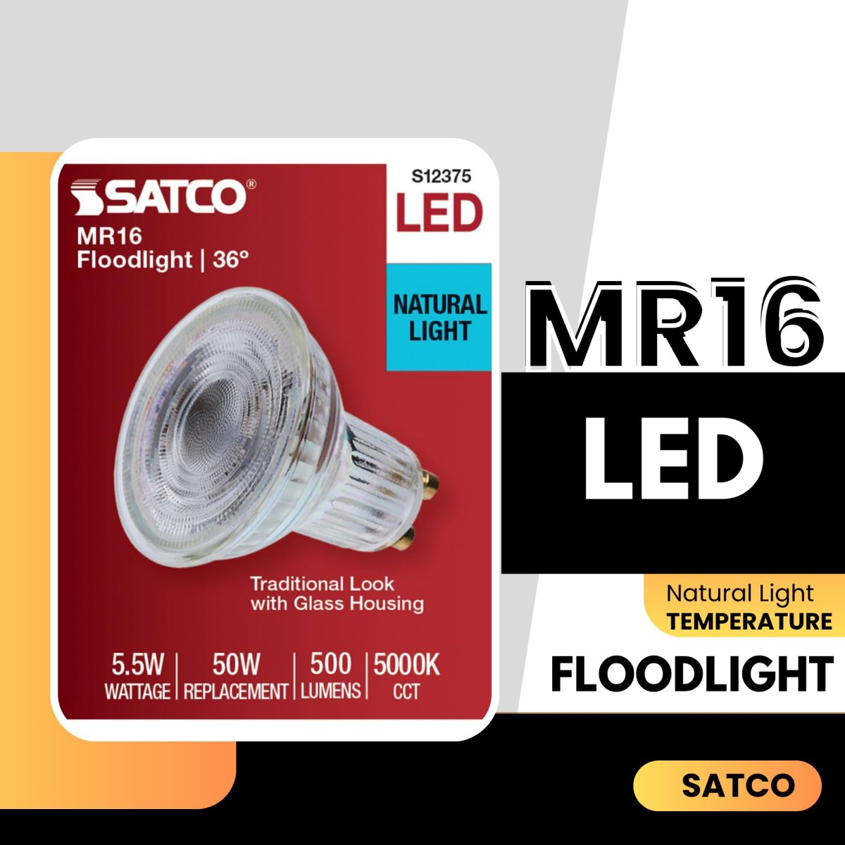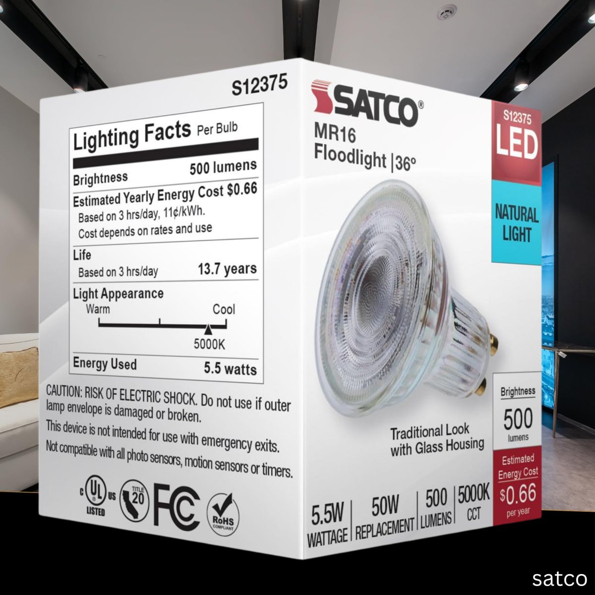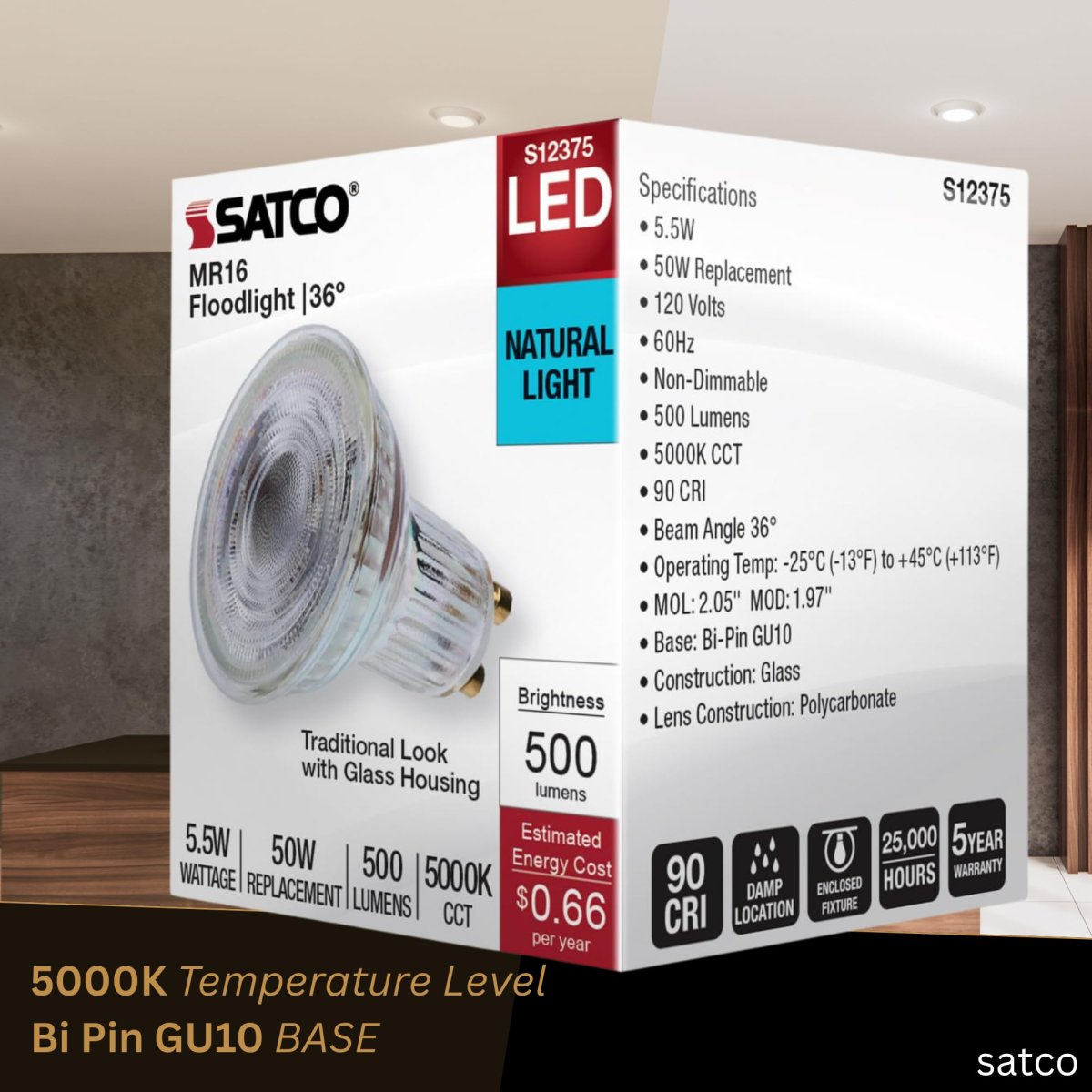 • Satco Led Mr16 Floodlight 5 5w 50w Equivalent 5000k Natural Light 90 Cri 36a Beam Gu10 Twist-lock Base 120v Dimmable Clear
