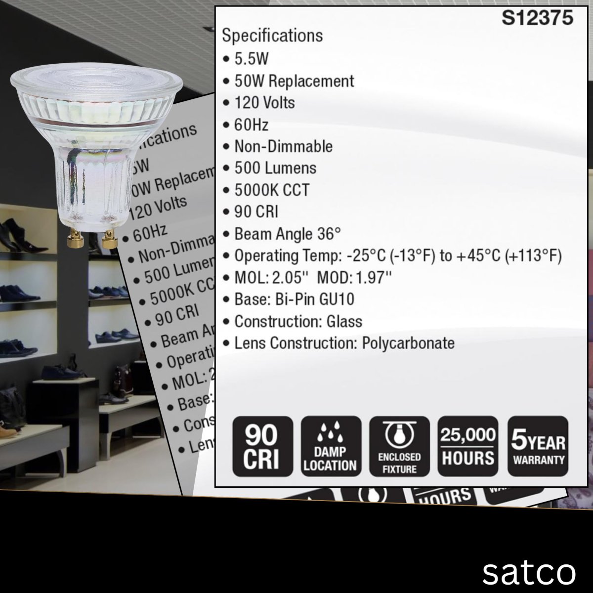 5000K Natural Daylight Output: Produces crisp, high-contrast lighting ideal for workspaces, retail displays, or utility areas.. 5.5W LED Replaces 50W Halogen: Delivers 500 lumens of bright light while reducing energy consumption by up to 85%.. 36 Beam Angle for Flood Lighting: Offers wide, uniform light coverage perfect for task or ambient lighting in directional fixtures.. GU10 Twist-Lock Base (120V): Provides secure and quick installation in standard GU10 sockets for residential or commercial use.. High CRI 90+ for Color Accuracy: Renders colors vividly and accurately, making it ideal for product presentation and visual tasks..