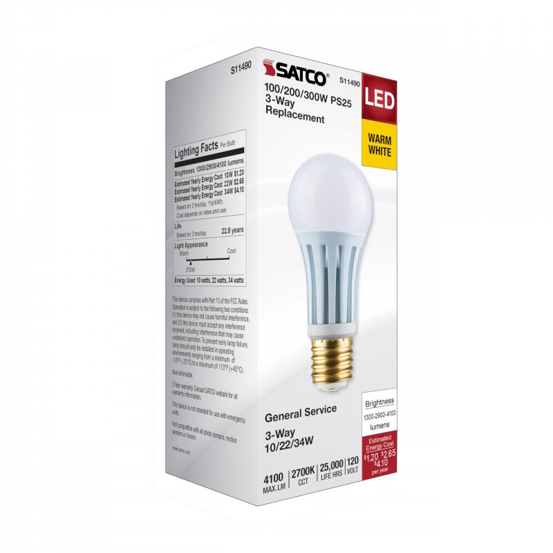 - Satco S11490 10 22 34ps25 3way Led 827 E39d E39d Mogul Screw Dc 2700k Warm White 220 Degree Beam Angle Cri 80 3 Way Base