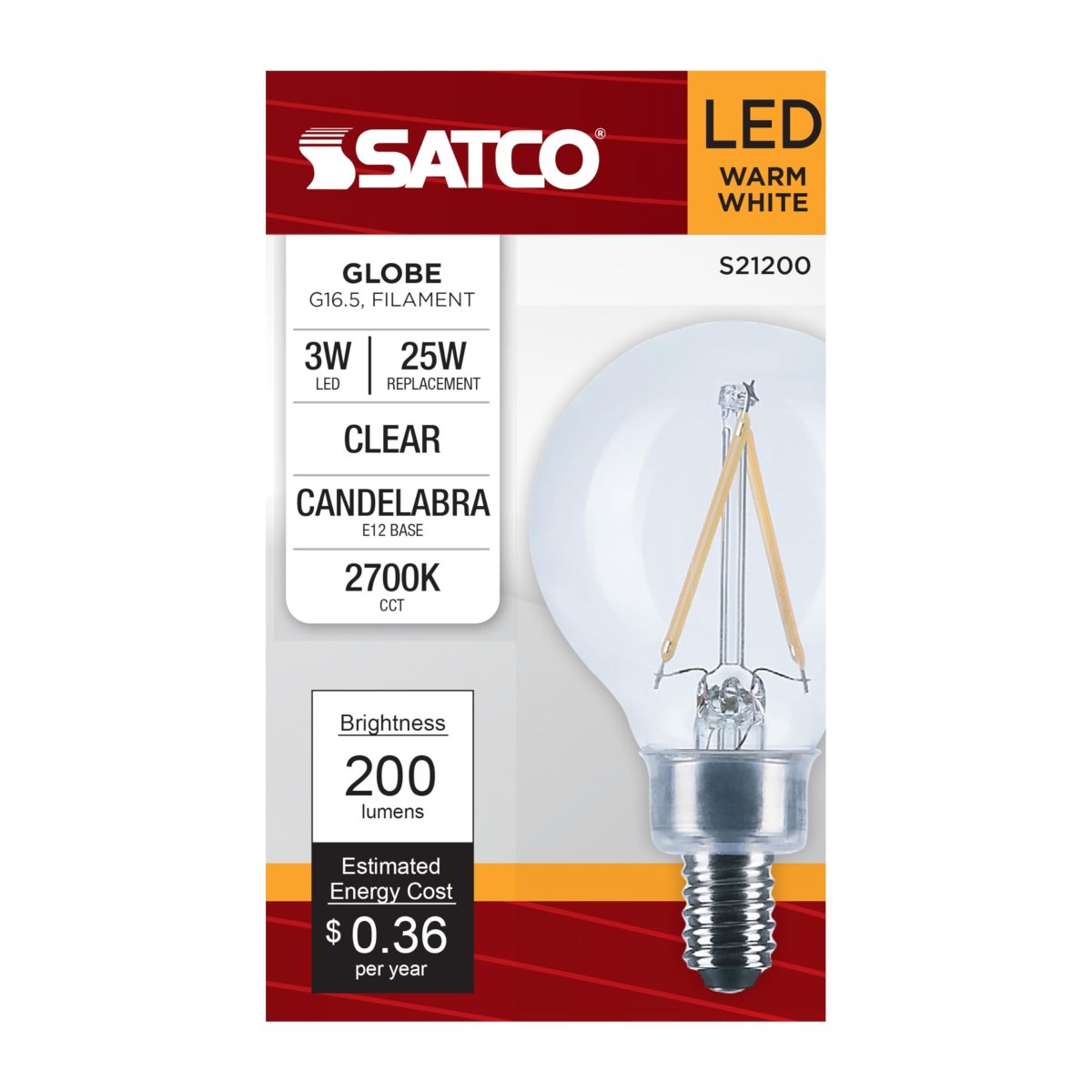 - Satco S21200 3w G16 5 Led Filament Lamp Clear Candelabra Base 2700k Warm White 200 Lumens 120v 25w Incandescent Equivalent Wet