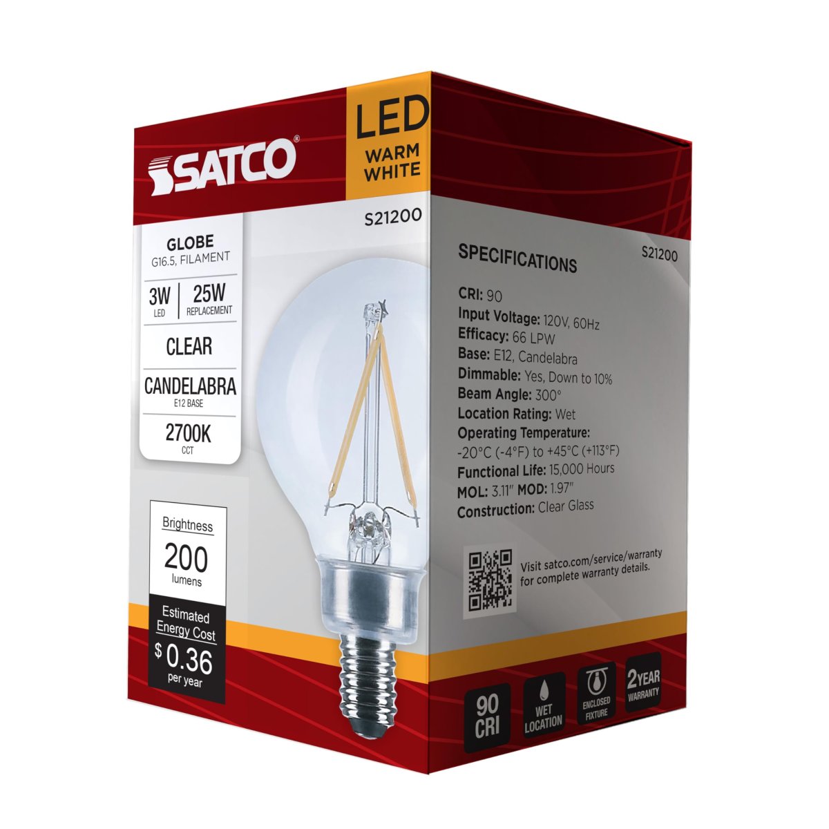Use a Satco 3W G16.5 LED filament lamp to deliver decorative warm light with lower energy use while maintaining familiar performance at a 25W incandescent equivalent. The clear finish highlights the filament style appearance for open shades, vanity bars, and accent fixtures where the bulb is part of the design.. Create a comfortable warm ambiance with 2700K color temperature and a broad 300 degree beam angle that supports more uniform light distribution in globe style applications. This combination works well in decorative fixtures that need a wide spread rather than a narrow beam.. Improve color quality with 90+ CRI light that helps reds, skin tones, and finishes look more natural compared to standard lamps. This is especially useful in bathrooms, dining areas, and hospitality spaces where accurate color appearance affects the look of the room.. Dimmable on 120V circuits with compatibility for forward phase, reverse phase, or phase selectable dimming, helping you fine tune brightness for different times of day. This supports smoother transitions from task lighting to lower level mood lighting without swapping lamps.. Built with glass and nickel plated aluminum materials and rated for 15000 hours to support dependable decorative use. A wet location rating expands placement options for suitable fixtures in areas where moisture may be present, and the lamp is rated for enclosed fixtures when used in appropriate housings..Other fine products