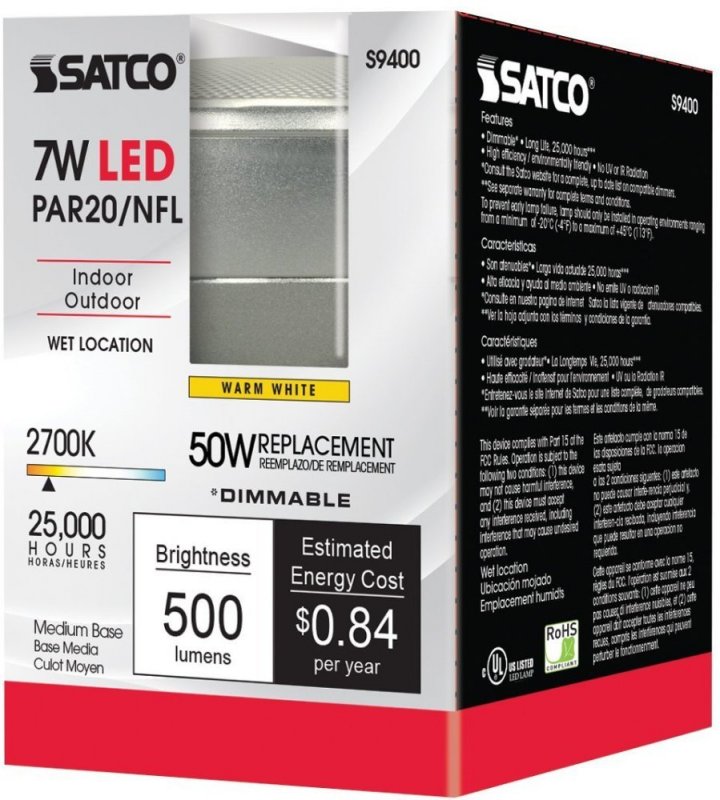 - Satco S9400 Solid State Led Light Bulb Pack Of 6 Silver 7 Watts 120 Voltage 525 Initial Lumens Par20 Lamp Shape Medium Base E26