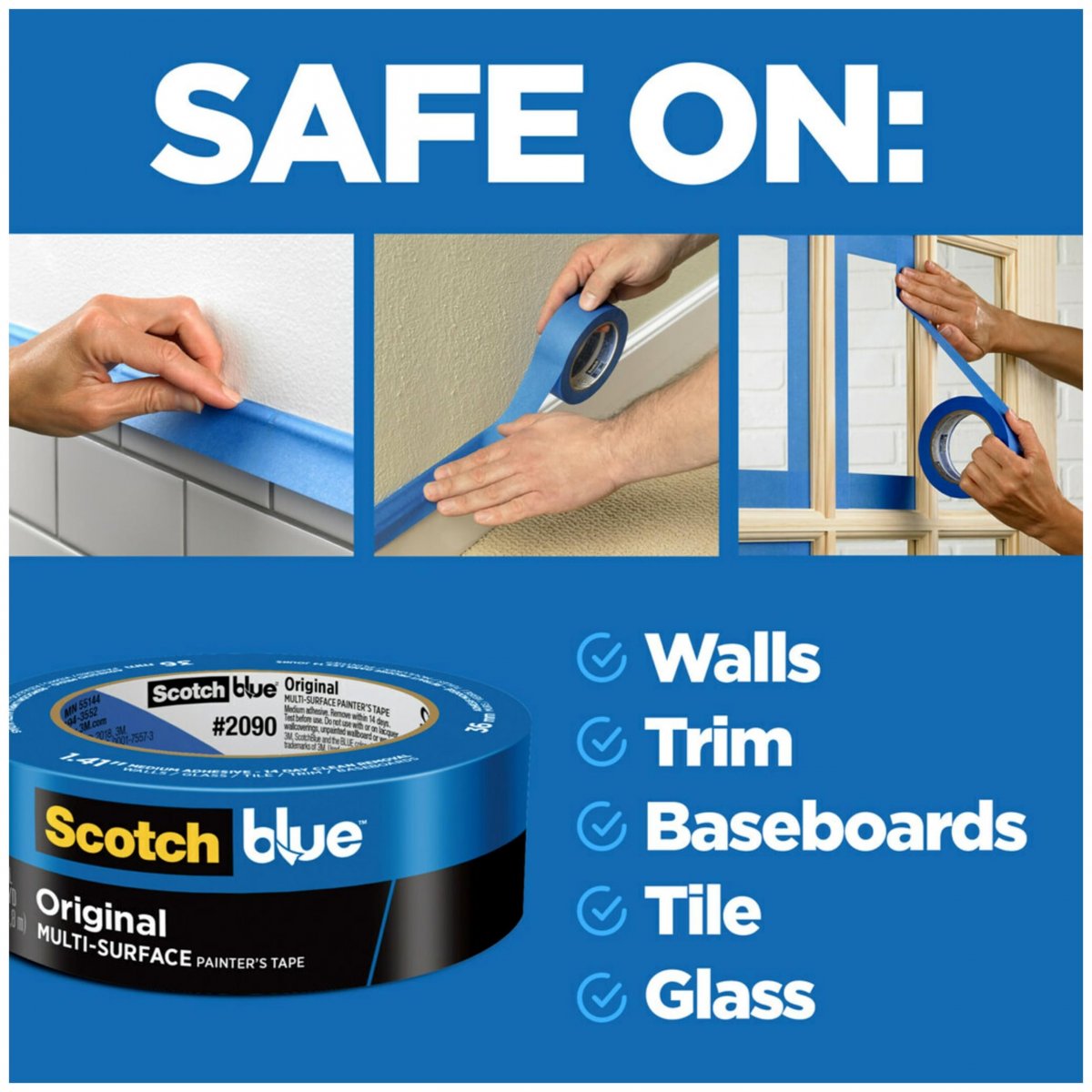 USE-ON SURFACES: Designed for use on multiple surfaces such as smooth or lightly textured walls, trim, baseboards, tile, and glass. DAYS CLEAN REMOVAL: 14-day interior and exterior clean removal leaves behind no damage or sticky residue. ADHESIVE LEVEL: Medium. PERFORMANCE: UV and sunlight resistant. SIZE: 1.88 in. x 60 yd. PACK OUT: 8 Rolls/Pack. SUSTAINABILITY: Made from 45% renewable resources; Solvent-free Adhesive; Tape made in a zero-landfill site certified for energy management (ISO 50001 certified), Core made with 70% post-consumer waste. APPLICATION TIPS: For great paint results make sure the surface is clean, dry and dust-free so that the tape sticks properly. Next, apply the tape onto the surface while pressing down firmly as you go. And lastly, let the tape set for about 30 to 60 minutes before painting. REMOVAL TIPS: Wait until the paint is dry to the touch before removing the tape. Lift the tape up by slowly pulling it back on itself, then removing at a 45-degree angle.Other fine products