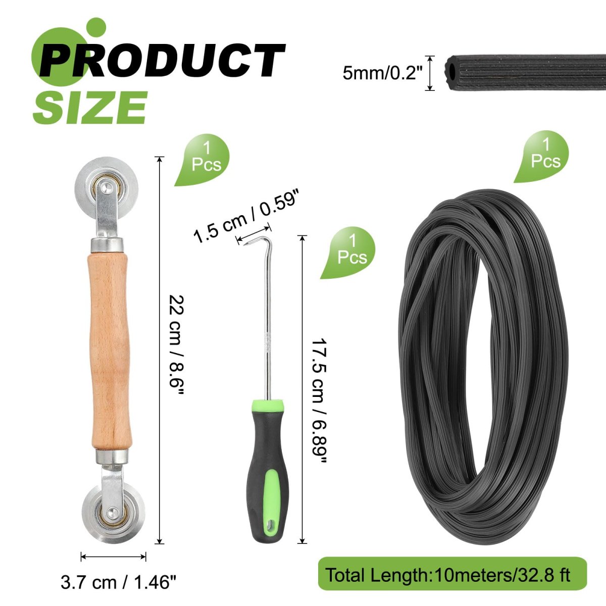 Size & Package: Screen Spline Length: 10m/32.8 ft; Screen Spline Diameter: 5mm/0.2 inch; Screen Roller Size: 22 x 3.7cm/8.66 x 1.46 inch(L*Dia); Removal Hook Size: 17.5 x 1.5cm/6.89 x 0.59 inch(Total Length*Hook Length); Package: 1Pcs x Screen Spline, 1Pcs x Screen Roller, 1Pcs x Removal Hook. Wide Application: The screen tool kit is versatile and suitable for all kinds of doors and windows that install mesh screens, such as garden screens, patio screens, porch screens, doors, and pool screens. How to Use: The screen tool kit includes screen strips, screen rollers, and removal hooks. You can cut the screen strips to the appropriate size, use the removal hook to hook out the old screen strips, and then use the roller to smoothly roll the screen spline and window screen into the window frame slot. Whether it is installation or replacement, this kit can meet your needs. Note: To ensure the right size, be sure to measure the width of the existing baffle in the screen frame before purchasing. When installing, avoid direct contact between the rollers and the screen to avoid damage. Design: The screen strip is made of TPE material with a serrated hollow design. It has excellent rigidity, durability, and is resistant to aging. The roller tool has a solid wood handle and double-ended rollers for easy use. The removal hook is a rubber handle with an ergonomic shape for a comfortable grip, providing a better grip and ease of use.Other fine products