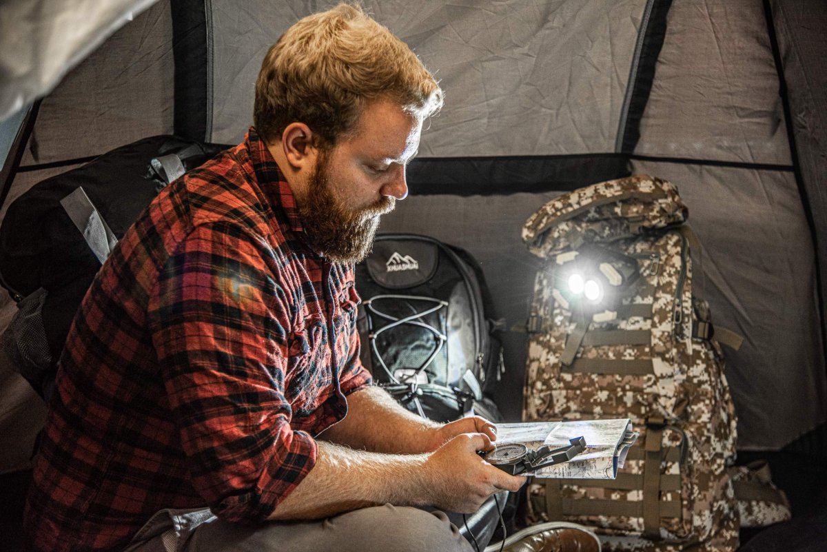 This light has a kickstand handle so you can conveniently carry it around or stand it up anywhere you need it.. There is a 2-stage switch, including COB flood light and LED spotlight. The COB bulbs have 300 lumens and produces dispersed light. The LED bulb has 100 lumens and provides focused light.. The approximate dimensions of the work light are 4 inches by 5.4 inches by 1.7 inch. (3) AA batteries are required and not included.. The battery compartment and push power button are located on the back of the light.. This work light is great for camping, emergency, home, office, outdoor adventures, etc.!.Other fine products
