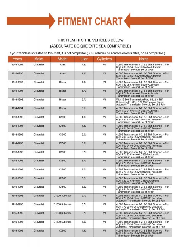 Fits 1-2, 2-3, 3-4 Shift Solenoid -- For 6Cyl 4.3L 2009-2013 GMC Savana 1500 Pair Automatic Transmission Solenoid Set of 2. Designed with the latest software and manufactured with modern toolingDesigned with the latest software and manufactured with modern tooling. Direct fit replacement. Installs the same as factory unit. Same dimensions as OE part.Other fine products