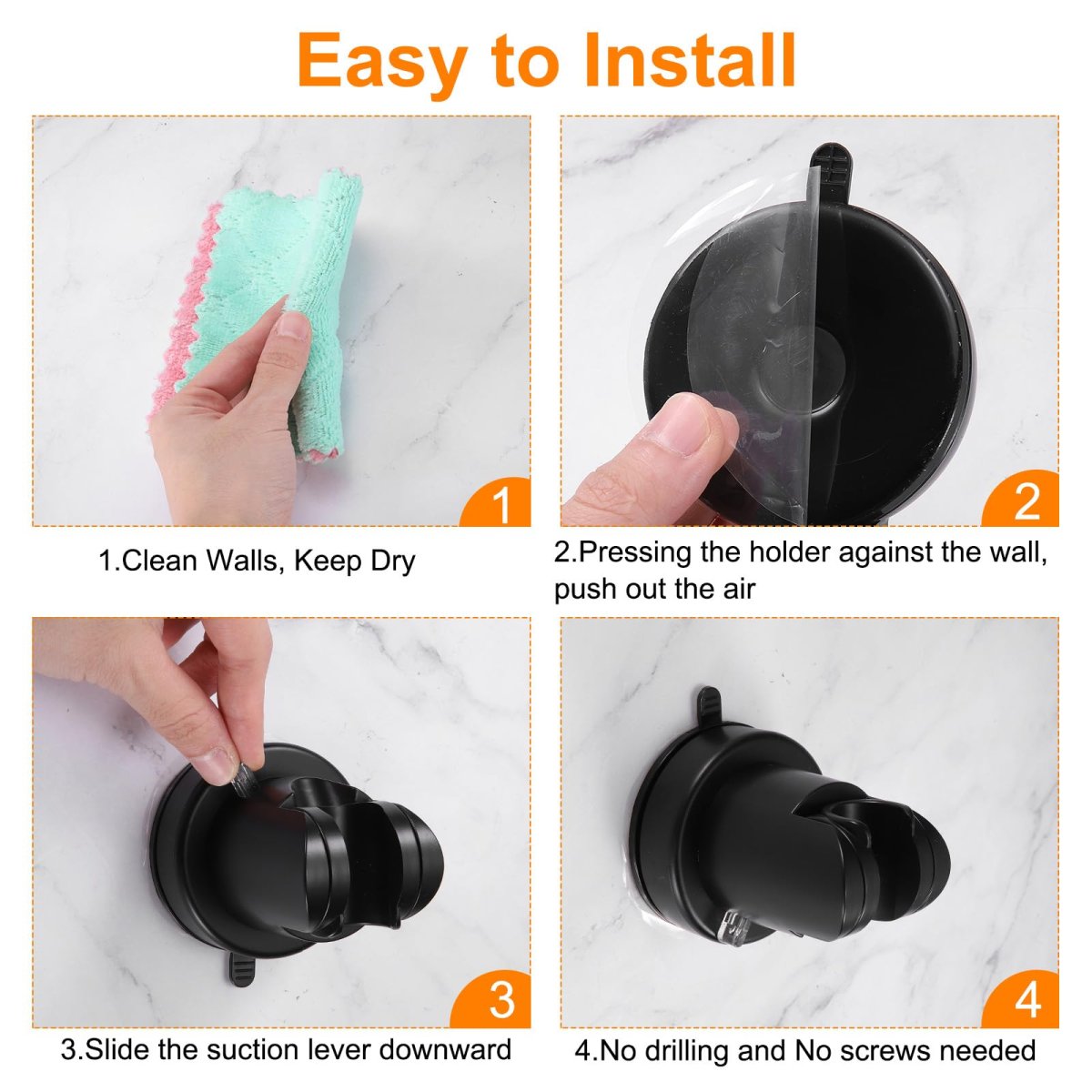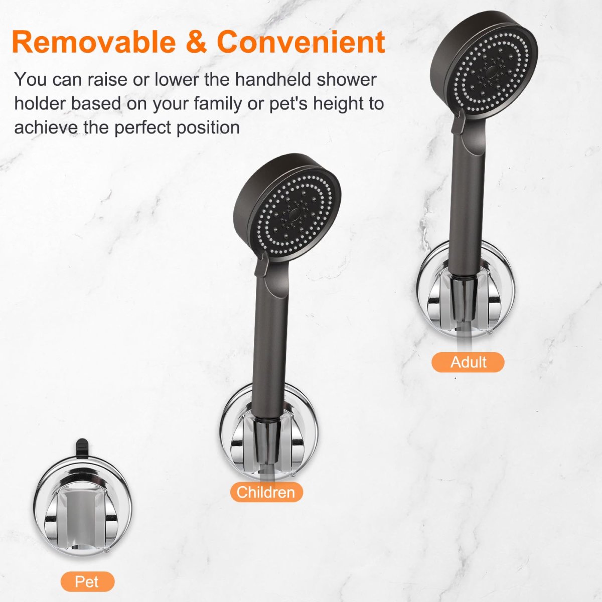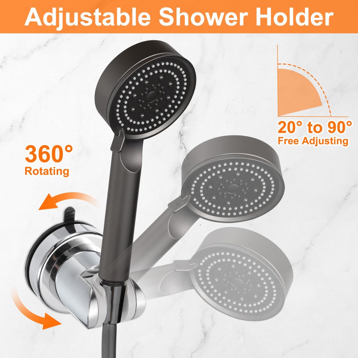 Rotating Suction Cup: The suction cup ensures the shower holder attaches to a smooth surface. The 360-degree rotating design can reposition the holder to meet your needs at various angles.. Adjustable Wall Mount Handheld Shower: The adjustable wall mount feature can move the handheld shower holder up or down based on family or pet height to achieve the perfect position that suits your needs and comfort.. ABS Material: The shower holder is made of ABS, sturdy, non-rusting, not easy to break, durable, not afraid of water drops, humidity or temperature differences, washable and reusable.. Wide Application: Fit more shower heads. Shower mounting brackets are suitable for smooth surfaces, such as ceramic tiles, marble, glass, smooth wood, etc.. Easy to Install and Adjust: No tools, no drilling, clean the contact surface with a cloth, press the suction cup against the wall, and then press the wall..Other fine products