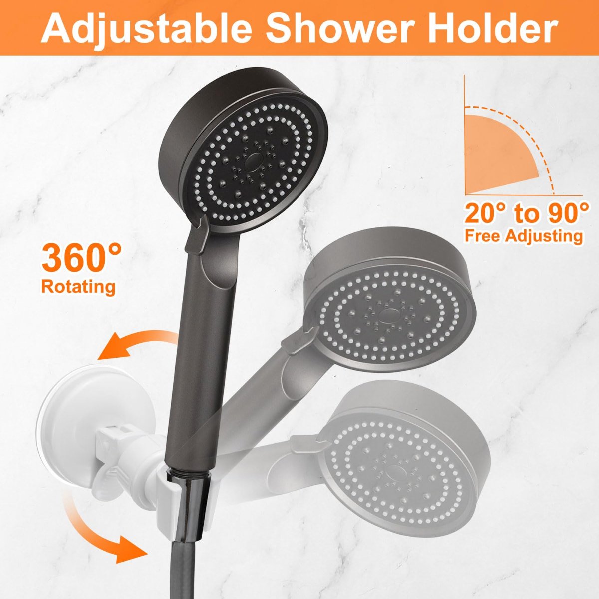 Rotating Suction Cup: The suction cup ensures the shower holder attaches to a smooth surface. The 360-degree rotating design can reposition the holder to meet your needs at various angles.. Adjustable Wall Mount Handheld Shower: The adjustable wall mount feature can move the handheld shower holder up or down based on family or pet height to achieve the perfect position that suits your needs and comfort.. ABS Material: The shower holder is made of ABS, sturdy, non-rusting, not easy to break, durable, not afraid of water drops, humidity or temperature differences, washable and reusable.. Wide Application: Fit more shower heads. Shower mounting brackets are suitable for smooth surfaces, such as ceramic tiles, marble, glass, smooth wood, etc.. Easy to Install and Adjust: No tools, no drilling, clean the contact surface with a cloth, press the suction cup against the wall, and then press the wall..Other fine products