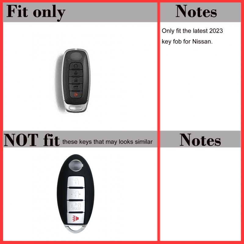 [Perfect Solution]The key fobs are very expensive to replace. This product offers a simple solution to protect, distinguish, and prevent broken & scratched up key fobs. Great protecting the fob case and all buttons,reduce push the button by accident,not interfere with the signal.. [Fit]Direct Compatible with new Type Remote Key Fob for Nissan 2023 2024. As long as it looks same with our key fob(shape, button layout, coners), then buy with confidence.. [Buyer's reviews]: "It's a rubberized sleeve but very smooth on the outside so it doesn't get caught up in jean pockets" "keys never get lost, my wife can easily locate her keys in her crowded purse" "I've had it for a while and have not noticed any wear or tear." "They fit snugly and allow the buttons & remote connections to work very well feels great" "Ordered the blue and pink one so my daughter and I fobs wouldnt get mixed up" "A small price to pay for keeping my fob pristine underneath". [Durable & Worry Free] silicone is very durable, you can use it for years, our silicone cover provide solid button signs for every key buttons, never worn off like the painted sign. super easy install,10 seconds to slide it in. [Professional]Not like other brands, we have been produce silicone case for more than 10 years, after testing for more than a hundred times, we find the best material and parameter for the silicone key cover, the silicone is slim enough to fit nice and snug, and thick enough to cushion your fob from accidental dropping..