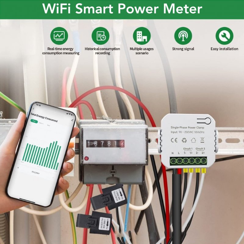Realtime Monitoring and Measurement: WiFi smart power monitor can be used in residential and store applications to monitor and measure realtime energy usage, voltage, current, power factor, active power and frequency in realtime.. Remote Control: WiFi intelligent electricity monitor meter not only monitors the energy consumption of appliances, but also allows you to remotely control the switches of appliances via mobile app, which is convenient for remote control when you are on the go.. Data Analysis: The power monitor can record the energy consumption data of electrical appliances. By analyzing these data, users can understand their power consumption habits and plan their energy use reasonably.. Safe: The power monitor meter is equipped with overload protection function, which can effectively avoid appliance failure and safety problems caused by excessive energy consumption of appliances.. Easy Installation: WiFi smart power monitor is easy to install, no professional skills are required, users can install it by themselves, and it is very convenient to use..